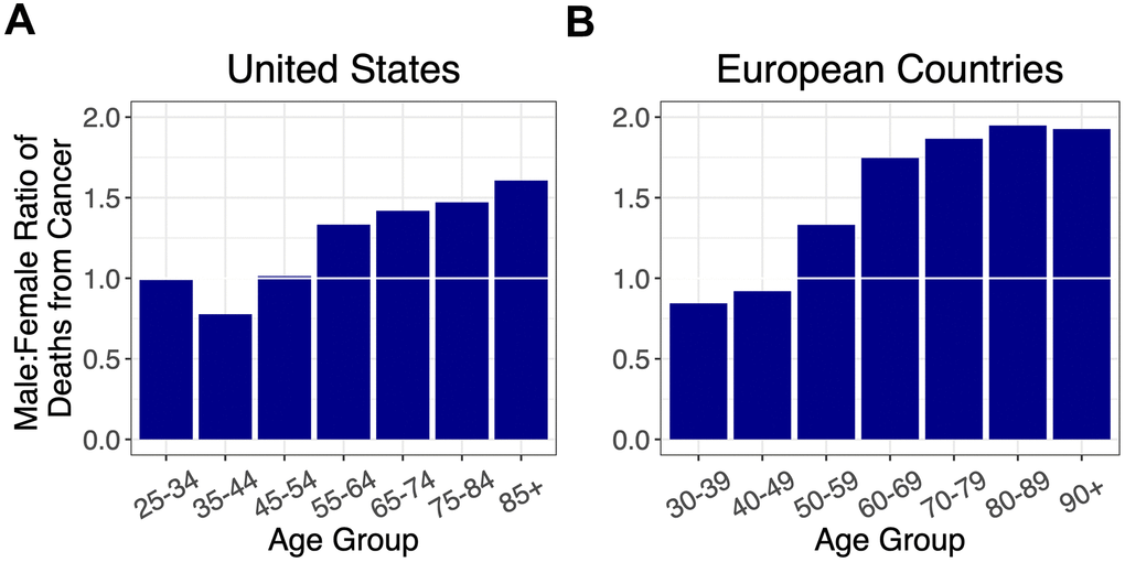 As cancer is the other leading cause of adult mortality in the US and Europe [13], we also examined the sex ratio for cancer mortality by age (Figure 3, Supplementary Figures 3, 4). The sex ratio for cancer mortality increased after midlife with no evidence of decline thereafter.