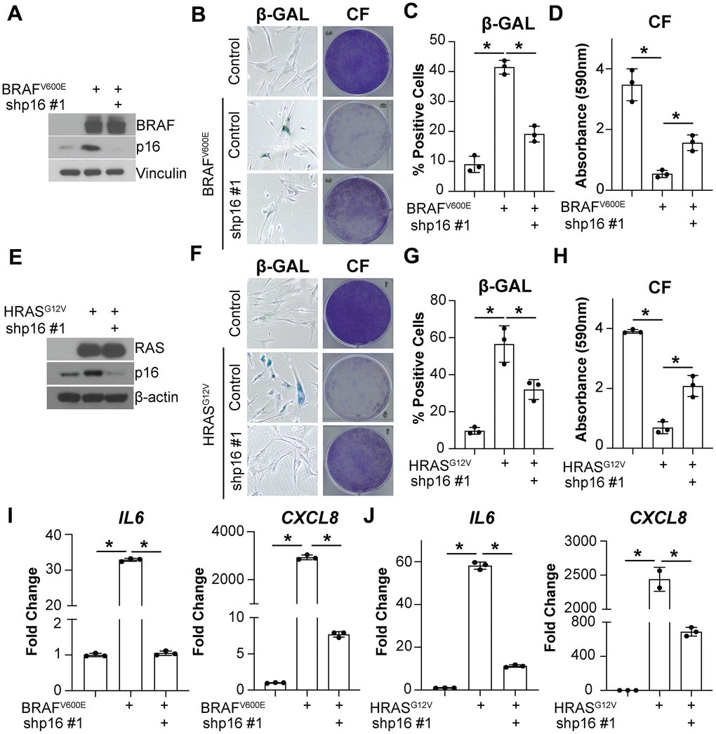 Upregulation of both p16 and SASP factors are characteristic of OIS cells [13]. A previous study found that overexpression of p16 induces senescence without upregulation of the SASP [60]. However, it is unknown whether p16 upregulation is necessary for SASP gene expression in the context of OIS. In order to better understand the effects of p16 expression on the SASP, we assessed the expression of the most extensively characterized interleukins upregulated in senescence, IL6 and CXCL8 [13, 16, 61]. Knockdown of p16 with BRAFV600E or HRASG12V overexpression (Supplementary Figure 1A) decreased IL6 and CXCL8 expression and suppressed senescence-associated β-galactosidase (SA-β-gal) activity and the cell cycle arrest in IMR90 fibroblasts (Figure 1A–1J), a classical model of OIS [5, 62]. Note that abrogation of p16 expression using these conditions occurs prior to the induction of senescence that typically occurs 2-3 days after oncogene activation [5, 63–65]. A second shRNA targeting p16 confirmed the results, suggesting these observations are not due to off-target effects (Supplementary Figure 1B–1F). Similar results were observed in normal skin fibroblasts Hs 895.Sk (Supplementary Figure 1G, 1H), suggesting this is not a cell line-specific phenomenon. Additionally, knockdown of p16 in the BRAFV600E-induced senescence model decreased the expression of other SASP factors including growth factors, proteases, and ligands (Supplementary Figure 1I), suggesting that this is a broader phenomenon not limited to IL6 and CXCL8. Together, these data suggest that knockdown of p16 may regulate the expression of multiple SASP factors upon oncogene activation.