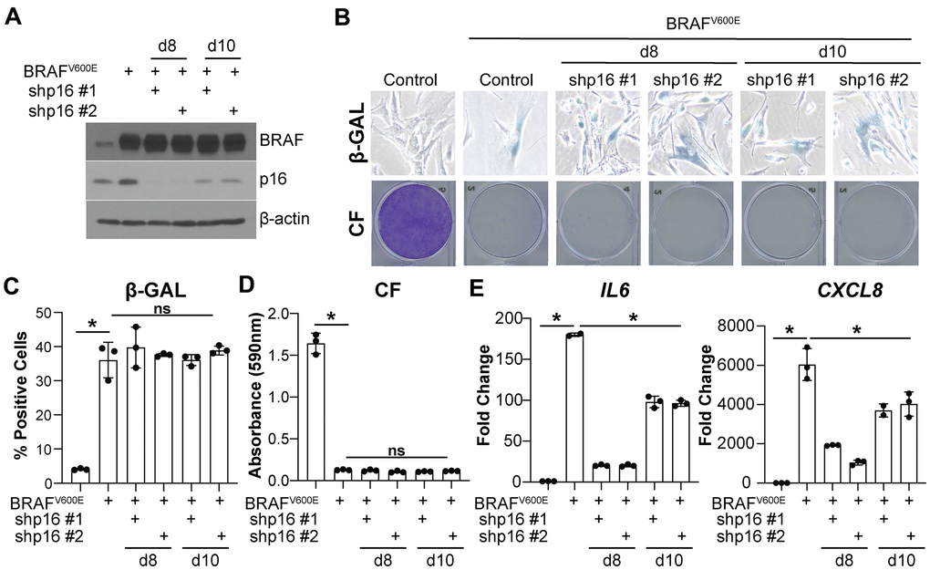 Senescence is considered a state of stable cell cycle arrest that can occur due to a variety of stimuli [1]. Oncogene-induced senescence (OIS) occurs upon activation of an oncogene such as HRAS or BRAF in normal cells [2, 3]. One of the hallmarks of senescent cells is upregulation of the cell cycle inhibitor CDKN2A (encoding for p16), which restrains cell cycle progression and cellular proliferation [4–6]. Canonically, elevated p16 represses hyperphosphorylation of the retinoblastoma protein (RB), which inhibits E2F transcription factor-mediated expression of proliferative genes [7]. Loss of p16 is a common event in human cancer that has been linked to senescence bypass, increased proliferation, and malignant transformation though both canonical and non-canonical (RB-independent) pathways [8–12].