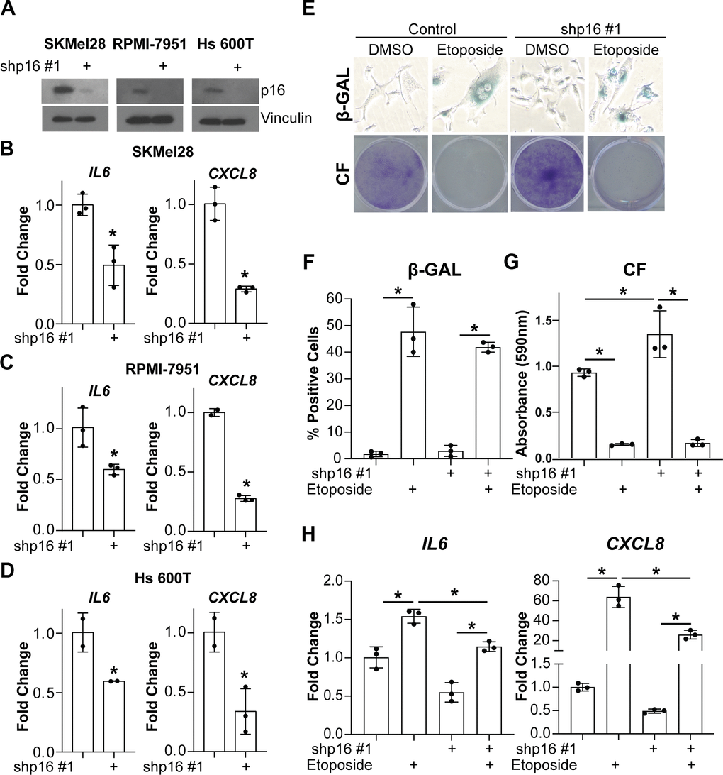 Next, we aimed to investigate whether suppression of p16 leads to decreased expression of IL6 and CXCL8 in tumor cells. Towards this goal, we knocked down p16 in three melanoma cell lines with wildtype p16 (Figure 3A). Consistent with our data in fibroblasts (Figures 1, 2), knockdown of p16 in the melanoma cells also decreased IL6 and CXCL8 (Figure 3B–3D). Notably, this was not a consequence of a reduced burden of spontaneous senescent cells in p16 knockdown cells (Supplementary Figure 3A, 3B). Finally, expression of IL6 and CXCL8 was also significantly reduced by stable knockdown of p16 in melanoma cells induced to senesce using etoposide (Figure 3E–3H). Etoposide induced senescence to a similar extent in both p16 wildtype controls and p16 knockdown cells, suggesting the decrease in expression was not linked to decreased senescence (Figure 3E–3G). Altogether, these data suggest that p16 may directly or indirectly regulate the transcription of both IL6 and CXCL8 and support the hypothesis that this is not a consequence of p16 suppression-mediated senescence bypass since suppression of p16 in both senescent and proliferating melanoma cells abrogates IL6 and CXCL8.