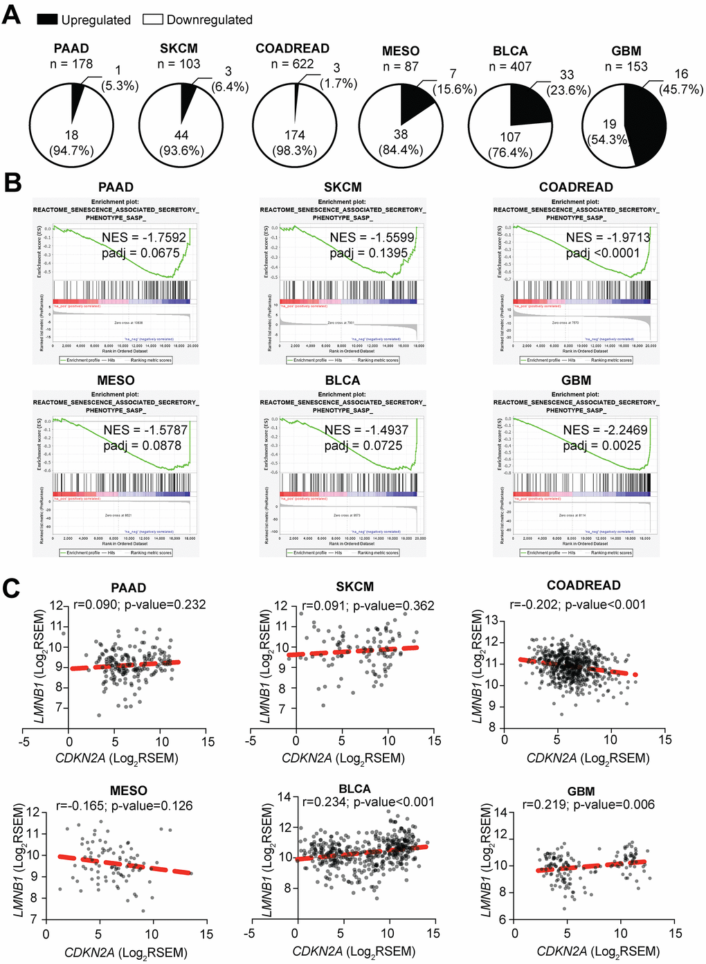 It has been widely demonstrated that suppression of p16 leads to increased proliferation, tumorigenesis, and metastasis in vitro and in vivo, and loss of p16 expression is considered a poor prognostic maker [66–69]. To further understand the relationship between loss of p16 and decreased expression of the SASP, we used TCGA data from primary tumors of skin cutaneous melanoma (SKCM, n=103), pancreatic adenocarcinoma (PAAD, n=178), colorectal adenocarcinoma (COADREAD, n=622), mesothelioma (MESO, n=87), bladder urothelial carcinoma (BLCA, n=407) and glioblastoma multiforme (GBM, n=153), six tumor types where loss of p16 is frequently observed and has clinical implications [70–77]. Patients were classified according to their CDKN2A status (p16-low or p16-high, see Methods for details) (Table 1), and differential expression analysis was performed independently for each tumor type. Note that there were no significant differences in the number of normal and tumor cells between p16-high and p16-low tumors (Supplementary Figure 4A). Most of the SASP factors profiled in a published database of RAS-induced senescence (including soluble factors and exosomes, 232 total unique genes) (Supplementary Table 1) [54], were significantly downregulated in p16-low tumors (Supplementary Figure 4A and Supplementary Table 2). Gene Set Enrichment Analysis (GSEA) also showed a decrease in ‘Senescence Associated Secretory Phenotype, SASP’ (Figure 4B) in p16-low tumors. Interestingly, 4 out of 6 tumors (PAAD, COADREAD, MESO, and BLCA) showed a decrease in pathways related to inflammation and the immune system such as ‘Antigen Processing and Presentation’ and ‘Cytosolic DNA Sensing Pathway’ in p16-low tumors (Supplementary Figure 4B). These data demonstrate that p16 status correlates with expression of SASP factors in human tumor samples. Importantly, to rule out the possibility of less senescent tumor cells in the p16-low patient samples, we used GSEA to cross-compare p16-low vs. p16-high expression profiles with a previously published senescence expression signature [78]. Among the 6 tumor types, only MESO showed a significant negative normalized enrichment score (NES) (Supplementary Table 3). This suggests that in 5 of the 6 tumor types, there was not a significant decrease in the number of intratumoral-senescent cells. Thus, the observed decrease in SASP expression signatures is likely not due to less intratumoral senescent cells. To unravel whether this observation is due to a decrease of immune cell infiltration in p16-low vs. p16-high tumors, we compared the number of infiltrating lymphocytes, monocytes, and neutrophils seen on OCT-embedded tissue slides reported by TCGA in 5 out of 6 tumors (note that there is no available data for GBM). No significant differences were observed between p16-low and p16-high tumors (Supplementary Figure 4C). These data at least in part suggest that changes in SASP expression are not due to differences in intratumoral senescent cells or differential infiltration of immune cells that could potentially bias our analysis.