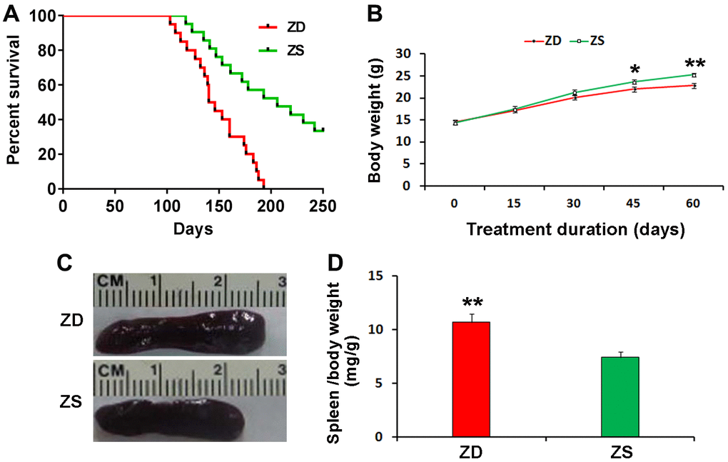 All mice were sacrificed at the endpoint of the second experiment. The spleen index (spleen weight/ body weight) was calculated. The data showed that ZD significantly increased the weight and index of the spleen. The spleen index of ZD group was 1.44 folds than ZS group (Figure 1C, 1D). It suggests that ZD may be related to the effect of promoting inflammation.