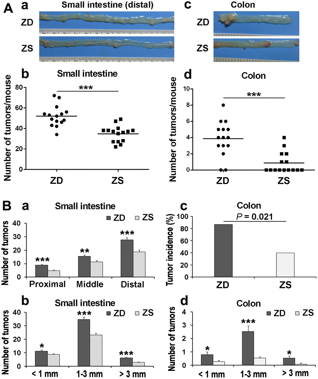 To determine the role of zinc in tumorigenesis, the number and the size of the tumors in the intestine and colon were observed and calculated under the dissecting microscope after 60 days ZD or ZS diet fed. The average number of small intestinal tumors in ZS group was 34.87 per mouse. The average number of tumors was 52.07 per mouse in the ZD group. The number of tumors in ZS group was significantly lower than that in the ZD group (Figure 2A: a, b). Similarly, the average number of tumors in the colon in ZD group (3.87 per mouse) was significantly increased than that in ZS group (0.87 per mouse) (Figure 2A: c, d).