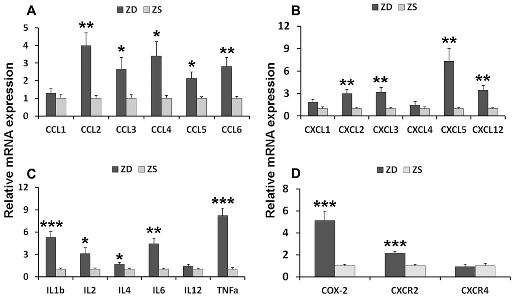 To investigate the potential mechanism of ZD-induced tumorigenesis, the inflammatory factors and related receptors were analyzed. The expression of levels of mRNA in the intestinal mucosa was detected by real-time PCR. Twenty-one mRNAs were analyzed. The results showed that ZD increased the mRNAs of C-C motif chemokines (CCL2, CCL3, CCL4, and CCL5), C-X-C motif chemokines (CXCL2, CXCL3, CXCL5, and CXCL12), C-X-C motif chemokine receptors CXCR2, Interleukin members (IL-1, IL-2, IL-4, IL-6, and IL-12), TNF-α and COX2 in the colonic mucosa (Figure 3).