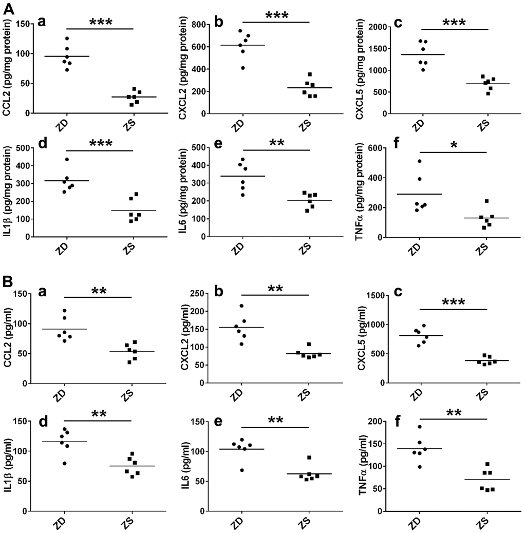 CCL2, CXCL2, CXCL5, IL1β, IL6 and TNF-α were measured by ELISA kits (Abcam, Cambridge, MA, USA) as described by the manufacturer’s instruction in serum. The samples were analyzed in duplicate.