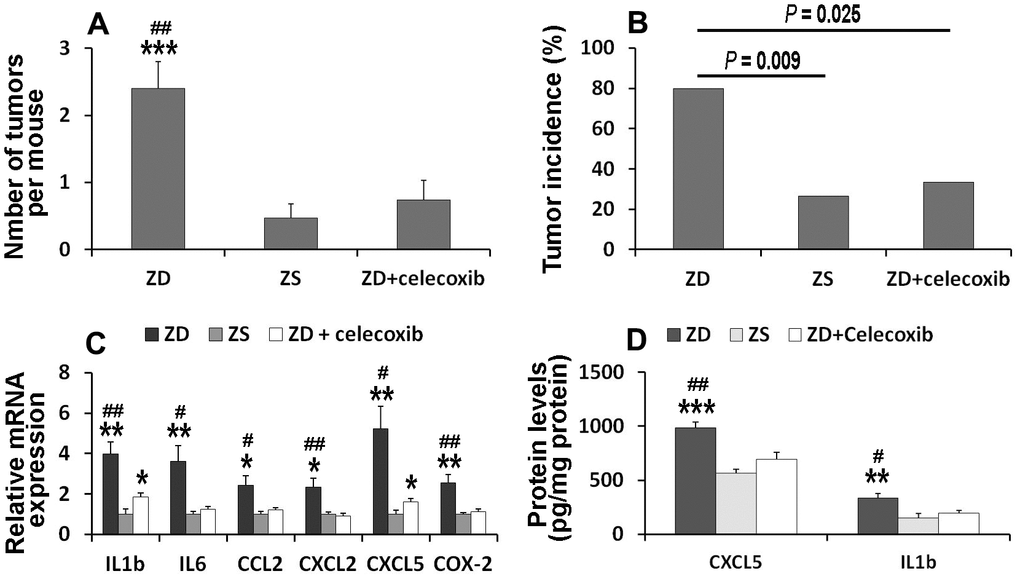 To clarify whether COX-2 signaling is involved in ZD-induced colon tumorigenesis, celecoxib, a selective COX-2 inhibitor, was orally administrated. The data showed that the number of tumors in ZD, ZS, and ZD + celecoxib groups were 2.4, 0.47, and 0.73, respectively (Figure 6A). The number of tumors per mouse in ZD group was significantly higher than that in ZS and ZD + celecoxib groups. However, there was no significant difference between ZS and ZD + celecoxib groups.