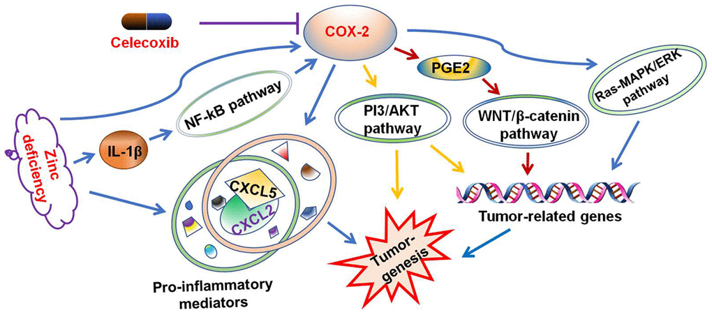 In conclusion, our results have indicated that Zinc deficiency accelerates colon tumorigenesis by activating pro-inflammatory mediators. Celecoxib attenuated ZD-induced colon tumorigenesis by inhibiting the expression of pro-inflammatory factors. Our novel findings reveal the role of ZD in colon carcinogenesis and provide a potential preventive strategy.