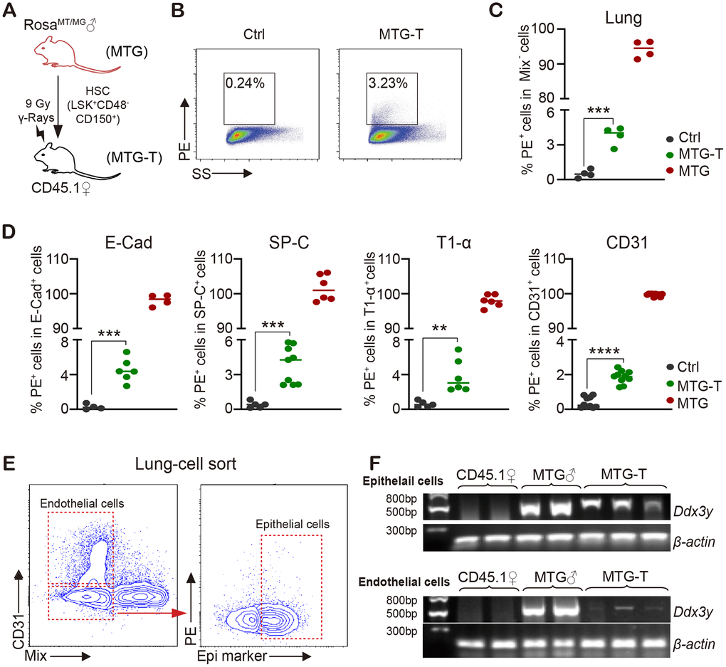 To test whether donor derived cells are present in recipient tissue cells, HSCs from male RosamT/mG mice were sorted and transplanted into lethally irradiated female CD45.1 mice (Figure 2A). 4 months after HSCT, the recipient mice were sacrificed, tdTomato/PE red fluorescence of donor mice and Ddx3y representing Y chromosome were detected in recipient mice. No-irradiated CD45.1 mice were used as negative control (marked as Ctrl); RosamT/mG mice were used as positive control (MTG); transplanted mice were marked as MTG-T.