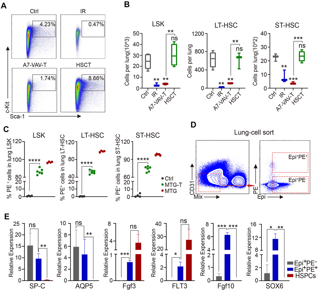 To explore how the BM HSCs repair the injured lung, HSPC (stained against LSK) and HSC residency in the lung were measured by flow cytometry. HSPC and HSC percentage and cell number in the lung all decreased significantly in irradiated group (IR). HSCT restored the HSPCs and HSCs, including LT-HSCs and ST-HSCs, but A7-VAV-T could not restore the injured HSCs in the irradiated lung (Figure 4A, 4B). To determine the source of these restored HSCs, the PE red fluorescence of the HSPCs and HSCs in the lung of MTG-T mice was measured, and it showed that most of the restored HSCs were donor-origin (Figure 4C). To investigate the function or gene expression in these donor-derived lung cells, the Epi+PE+ and Epi+PE- cells in the MTG-T lung were sorted (Figure 4D), and HSPCs from donor were used as control. The Epi+PE+ and Epi+PE- cells both expressed SP-C (alveolar type II epithelial cell marker) and AQP-5 (alveolar type I epithelial cell marker), which confirmed the epithelial characteristics of the PE+ cells in the lung (Figure 4E). Fgf3 and FLT3 (HSC specific genes, [32, 33]) were expressed in the Epi+PE+ cells, suggesting that the cells were derived from donor HSCs. Fgf10 (Fibroblast growth factor 10) and SOX6 (SRY-Box Transcription Factor 6), which are involved in damage repair [34, 35], were only expressed in the Epi+PE+ cells, not in Epi+PE- cells, indicating that these PE+ epithelial cells were repaired cells (Figure 4E). These data further suggested that upon irradiation, HSCs from donor BM may migrate to the lungs of the recipients and some of them can be transdifferentiated into lung epithelial cells to repair the lung injury.