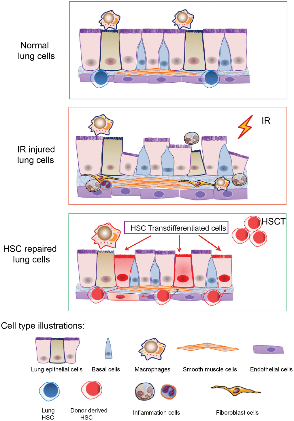 In summary, we conclude that donor HSCs from bone marrow may migrate to the injured lung of the recipient, and some of them can be transdifferentiated to lung epithelial and endothelial cells to repair the injury caused by radiation. Future study is still warranted to illustrate the underlying mechanism for HSC transdifferentiation.