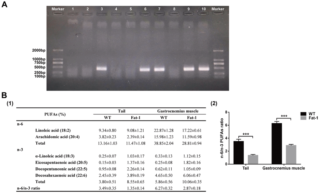 The offspring were identified by genotyping of the 250~500-bp PCR product. There was a representative gel showing samples from WT mice which do not express the fat-1 gene at lines 1, 2, 4, 5, and 8 compared with samples from fat-1 mice at lines 3, 6, 7, 9, and 10 (Figure 1A). Furthermore, n-3 PUFA levels were significantly higher and the n-6/n-3 PUFA ratio was significantly lower in the tail and gastrocnemius muscle tissue samples of fat-1 mice compared to the wild-type mice (Figure 1B).