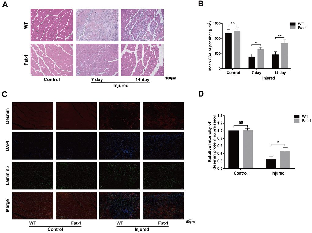 The cardiotoxin-induced gastrocnemius muscle injury model in 3-week-old fat-1 mice and their wild-type littermates was established as described previously [46]. The mice were killed by cervical dislocation on days 3, 7, and 14 after CTX injections. The gastrocnemius muscles were harvested for further analysis.