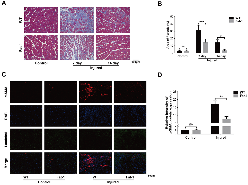 Next, we evaluated if endogenous levels of n-3 PUFAs alleviate muscle injury by analyzing histological changes in the gastrocnemius muscle tissues of fat-1 mice compared to the wild-type mice after CTX-induced muscle injury. H&E staining analysis showed that muscle fiber size was better preserved in the fat-1 mice compared to the wild-type mice on days 7 and 14 after injury (Figure 2A, 2B). Next, we performed immunofluorescence labeling using antibodies against desmin, laminin5, and DAPI (Figure 2C). Desmin is an intermediate filament protein that is highly expressed in the immature muscle fibers during regeneration [18]. The intracellular desmin expression was significantly higher in fat-1 mice on day 7 after CTX-induced muscle injury compared to the wild-type mice (Figure 2D). We then quantified the degree of muscle fibrosis using Masson's trichrome staining of gastrocnemius muscle tissue sections of fat-1 and wild-type mice subjected to CTX-induced muscle injury. The histological analysis showed that muscle fibrosis was significantly lower in the fat-1 mice compared to the wild-type mice on days 7 and 14 after CTX-induced muscle injury (Figure 3A, 3B). Moreover, immunofluorescence results showed that the levels of α-SAM, a classic myofibroblast marker, were significantly lower in the fat-1 mice compared to the wild-type mice (Figure 3C, 3D). Taken together, these data demonstrated that fat-1 gene expression and high endogenous n-3 PUFA levels preserved the structural integrity of the muscle fibers and increased healing in response to CTX-induced muscle injury.