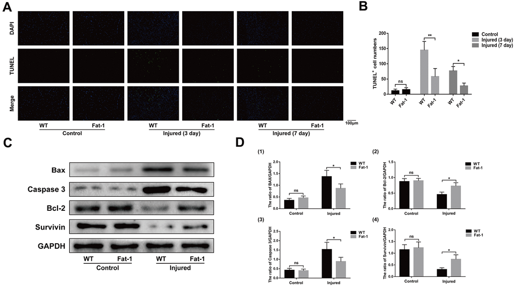 TUNEL staining analysis showed significantly higher numbers of apoptotic cells in the injured gastrocnemius muscles of the wild-type mice on days 3 and 7 after CTX injection compared to the fat-1 mice (Figure 5A, 5B). Furthermore, western blot analysis showed that the levels of pro-apoptotic proteins, Bax and Caspase-3, were significantly lower and the levels of anti-apoptotic proteins, Bcl-2 and Survivin, were significantly higher in the gastrocnemius muscles of fat-1 mice on day 3 after CTX-induced injury compared to the wild-type mice (Figure 5C, 5D).