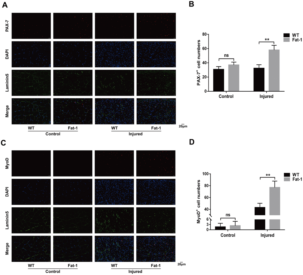 Next, we tested if higher endogenous levels of n-3 PUFAs promote muscle regeneration after injury by analyzing the expression of PAX-7 and MyoD. PAX-7 is a specific marker of satellite cells and MyoD is a marker for satellite cell activation. Immunofluorescence results showed significantly higher numbers of PAX-7-postitive (Figure 6A, 6B) and MyoD-positive cells (Figure 6C, 6D) in the gastrocnemius muscle sections of fat-1 mice compared to the wild-type mice on day 3 after CTX-induced muscle injury. These results showed significantly higher rate of satellite cell activation in the gastrocnemius muscle tissues of fat-1 mice compared to the wild-type mice on day 3 after CTX-induced muscle injury.