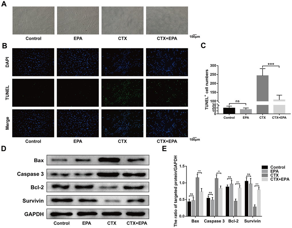 EPA is one of the most common long chain n-3 PUFA. Therefore, we investigated if EPA reduced in vitro apoptosis in cardiotoxin-induced C2C12 cells. The morphological changes in differentiated C2C12 cells treated with 0.5 μM cardiotoxin with or without 50 μM EPA for 24 h are shown in Figure 7A. TUNEL-staining analysis showed that EPA significantly reduced apoptosis of CTX-induced C2C12 cells compared to the controls (Figure 7B, 7C). Western blot analysis showed that EPA treatment reduced the levels of BAX and Caspase-3 proteins and increased the levels of Bcl-2 and Survivin proteins in cardiotoxin-induced C2C12 cells compared to the corresponding controls (Figure 7D, 7E). Overall, these results showed that EPA suppressed apoptosis of CTX-induced C2C12 cells, thereby confirming the results observed in CTX-induced fat-1 mice.