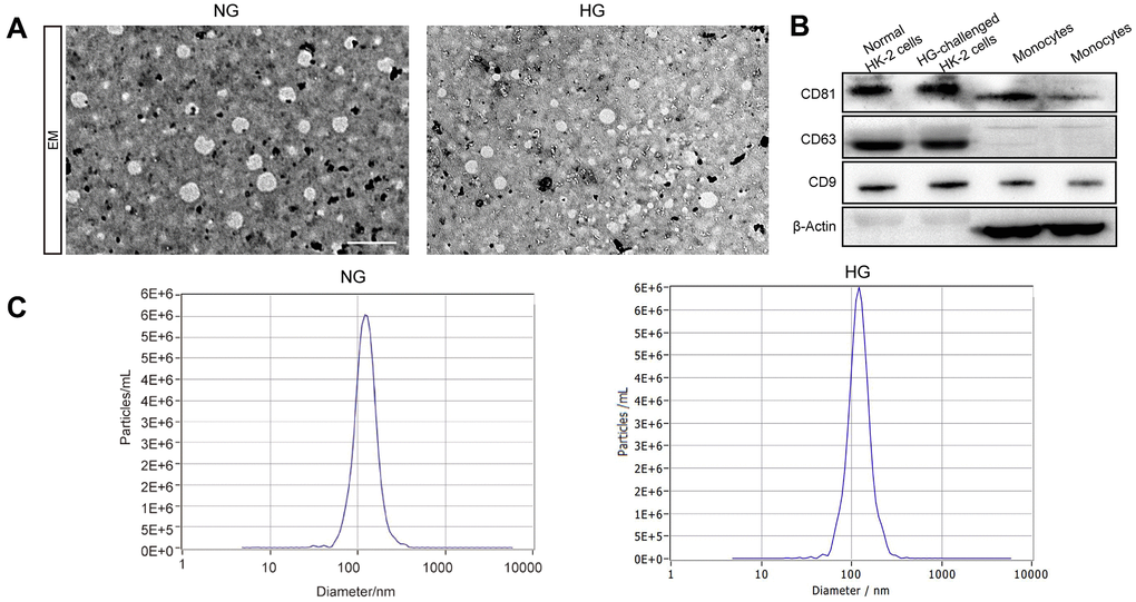 We first extracted exosomes from the culture supernatant of both the high-glucose-induced group and the control group. The characterization of exosomes, including their shape and size, was presented using TEM. The image indicates a round shape of exosomal vesicles and including size ranging from 47 to 154 nm (Figure 1A). We investigated the expression of the exosomal markers CD63, CD9, and CD81 in the exosomes isolated from these two groups and found them expressed in all of our samples (Figure 1B). Next, Exosome size was also identified by NTA, which indicated a mean size of 116.8nm in exosomes isolated from high glucose-induced HK-2 cells and 119.3nm in those isolated from normal HK-2 cells (Figure 1C). Taken together, our results indicated that the vesicles derived from high glucose-induced and normal HK-2 cells in line with the trend of exosome distribution.