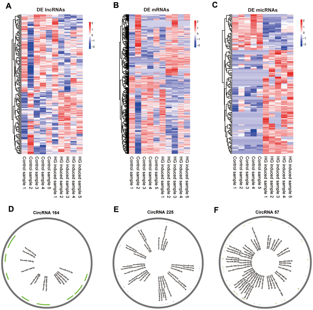 The whole-transcriptome sequencing data (lncRNA, circRNA, miRNA, mRNA) of five high-glucose induced samples and five control samples were obtained by hierarchical clustering. A total of 169 significantly expressed exo-lncRNAs were identified, including 93 upregulated lncRNAs and 76 downregulated lncRNAs (Figure 2A). The top five upregulated lncRNAs were RP11-178L8.9, CTD-2530H12.2, RP11-503N18.4, RP11-20B24.7 and RP11-256I23.1, and the top five downregulated lncRNAs were RP11-517A5.7, RN7SL870P, CTD-2298J14.2, ANKRD10-IT1 and AP000442.1. In addition, a total of 885 exo-mRNAs were differentially expressed (Figure 2B). Among these exo-mRNAs, 403 were upregulated and 482 were downregulated in the HG groups compared with the control groups. Meanwhile, the top five upregulated mRNAs included CASP7, ZNF766, AL603965.1, ELK3 and MRPL36, and downregulated mRNAs included FASLG, MRPL42, AL137002.1, CLTC and MT-ND6. In the same way, 152 exo-microRNAs were identified as being differential expressed (Figure 2C). Of these exo-microRNAs, 113 were identified as upregulated, and 39 were identified as downregulated. The top five upregulated microRNAs were hsa-miR-6724-5p, hsa-miR-6716-3p, hsa-miR-2355-3p, hsa-miR-135b-3p and hsa-miR-3180. The top 5 downregulated microRNAs were hsa-miR-5008-3p, hsa-miR-6785-5p, hsa-miR-3654, hsa-miR-335-3p and hsa-miR-3074-3p. Finally, only 3 circRNAs were specifically dysregulated, and they were all downregulated in the HG groups, including circRNA_164, circRNA_225 and circRNA_57. Information on these identified circRNAs is presented in Table 1. To further predict the function of differentially expressed exo-circRNAs, we established the circRNA/microRNA interaction based on the Circular RNA Interactome database (https://circinteractome.nia.nih.gov/).