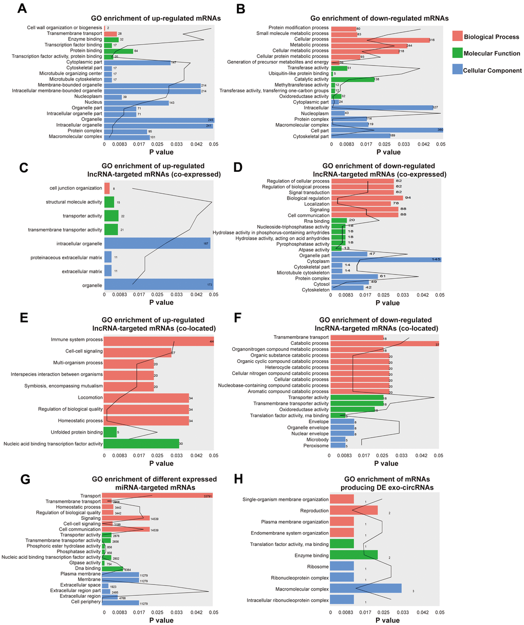 GO enrichment analyses were conducted to explore the potential function of differentially expressed exo-lncRNAs, mRNAs, circRNAs and miRNAs. GO classification showed that 2 biological processes (BPs), such as transmembrane transport, 4 molecular functions (MFs), such as transcription factor activity-protein binding, and 17 cellular components (CCs), such as macromolecular complex, were the major functions of these upregulated exo-mRNAs (Figure 3A). Twenty biological processes (BPs), such as cellular metabolic process, 6 molecular functions (MFs), such as methyltransferase activity, and 27 cellular components (CCs), such as cell part, were the major functions of these downregulated exo-mRNAs (Figure 3B). In addition, under the hypothesis that exo-lncRNA function could be associated with the known function of their targeted mRNAs, including colocated and coexpressed mRNAs, lncRNA-targeted mRNAs were further mapped with GO terms. The results show that GO items of upregulated exo-lncRNA-targeted mRNAs (coexpressed) were involved in 1 biological process (BP) called cell junction organization, 3 molecular functions (MFs), such as transporter activity, and 4 cellular components (CCs), such as extracellular matrix (Figure 3C). GO items of downregulated exo-lncRNA-targeted mRNAs (coexpressed) were involved in 30 biological processes (BPs), such as signal transduction and regulation of biological process, 6 molecular functions (MFs), such as pyrophosphatase activity and RNA binding, and 13 cellular components (CCs), such as protein complex (Figure 3D).