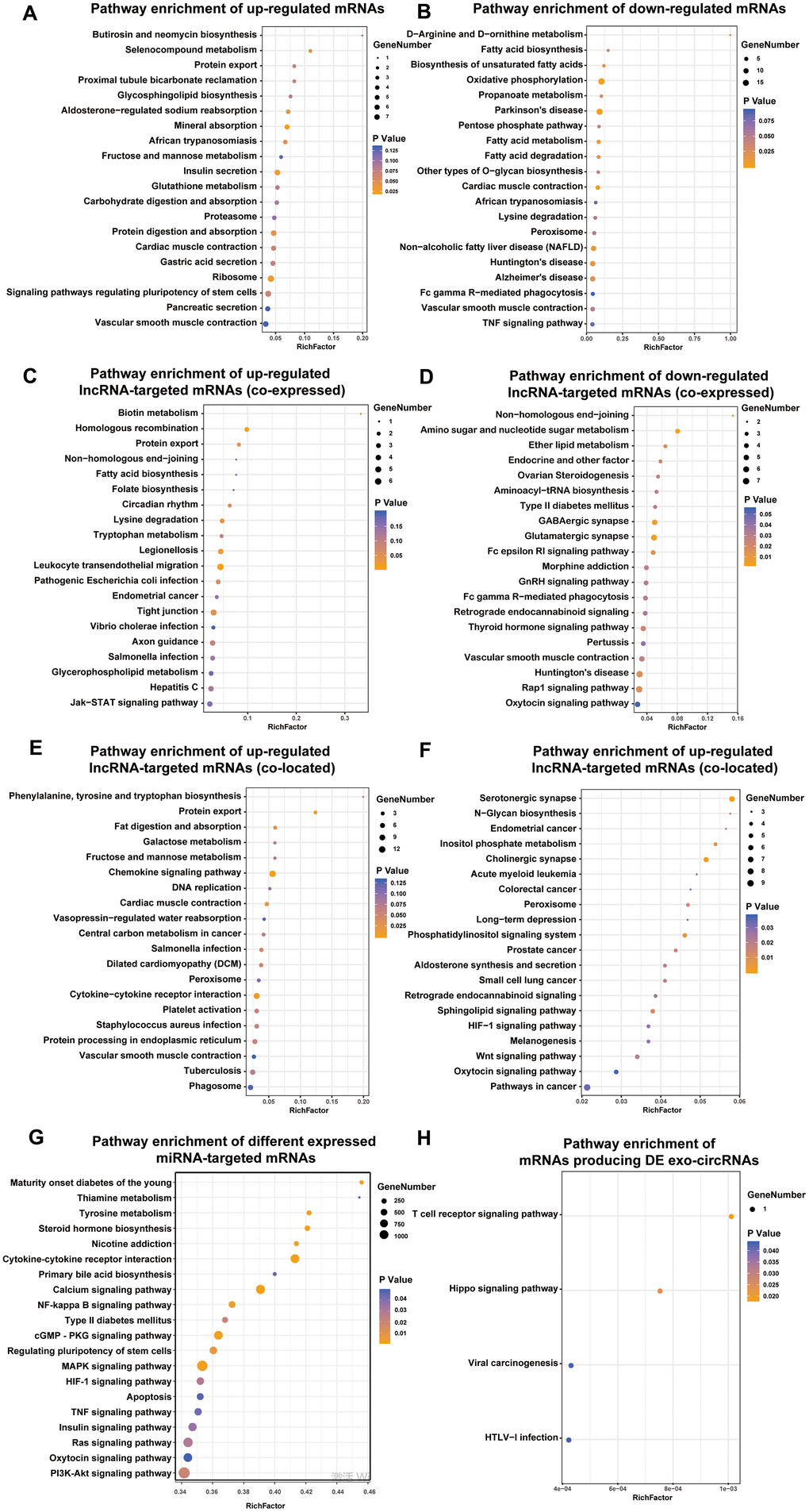 With respect to differentially expressed lncRNA-targeted mRNAs (colocated and coexpressed mRNAs), up- and downregulated lncRNA-targeted mRNAs (coexpressed) were related to such pathways as biotin metabolism, type II diabetes mellitus, amino sugar and nucleotide sugar metabolism, and the GnRH signaling pathway (Figure 4C–4D). Up- and downregulated lncRNA-targeted mRNAs (colocated) were related to such pathways as the chemokine signaling pathway, fat digestion and absorption, N-glycan biosynthesis and HIF-1 signaling pathway. In addition, mRNAs targeted by the up- and downregulated exo-miRNAs were associated with such pathways as maturity onset diabetes of the young, type II diabetes mellitus, and insulin signaling pathway (Figure 4G). Furthermore, mRNAs producing DE exo-circRNAs were associated with such pathways as the Hippo signaling pathway and T cell receptor signaling pathway (Figure 4H).