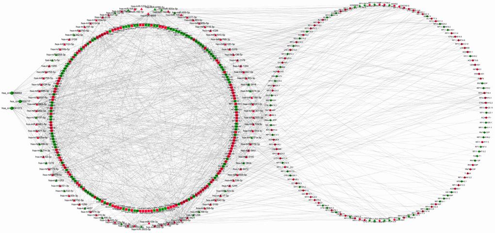 To investigate the interaction between the exo-lncRNAs, circRNAs and miRNAs and mRNAs, the circRNA-lncRNA-miRNA-mRNA network was constructed according to the ceRNA hypothesis by integrating expression profile data and their regulatory relationships. We first utilized miRanda and TargetScan software to predict miRNA binding sites of the DE exo-circRNA and exo-lncRNAs. Then, we extracted differentially expressed miRNAs from the intersection of these predicted miRNAs targeted by DE exo-circRNAs and exo-lncRNAs. Following this step, we forecasted DE exo-mRNAs that were potential targets of these DE miRNAs. Finally, a network of DE exo-circRNA-lncRNAs-miRNAs-mRNAs, including a total of 3 circRNAs, 137 lncRNAs, 102 miRNAs and 207 mRNAs, was visualized by Cytoscape (Figure 5).