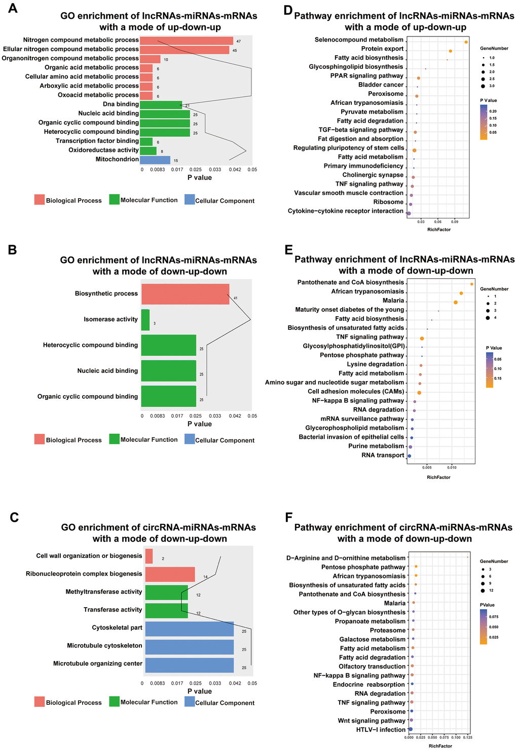 Functional enrichment analysis indicated that DE lncRNAs/circRNAs-miRNAs-mRNAs with an up-down-up expression pattern were related to BPs, such as oxoacid metabolic process, MFs, such as DNA binding, and CCs, such as the mitochondria (Figure 6A). Additionally, DE lncRNAs-miRNAs-mRNAs with a mode of down-up-down were related to BPs, such as biosynthetic processes, and MFs, such as nucleic acid binding (Figure 6B). DE circRNAs-miRNAs-mRNAs with a mode of down-up-down were associated with BPs, such as cell wall organization or biogenesis, MFs, such as methyltransferase activity, and CCs, such as cytoskeletal part (Figure 6C).