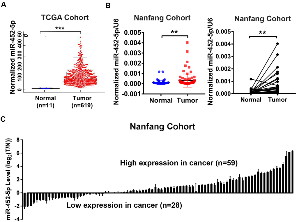 MiR-452-5p expression was analyzed using the Cancer Genome Atlas (TCGA) database, which indicated the up-regulation of miR-452-5p in CRC (Figure 1A). Furthermore, 87 CRC tissues and matched para-carcinoma mucosal tissue samples were used for real-time quantitative PCR (qRT-PCR) to verify the results. As a result, the miR-452-5p expression significantly increased in CRC tissues than in para-carcinoma mucosal tissue samples (Figure 1B, 1C). Analysis of clinicopathological features of 87 CRC patients showed that patients with high expression of miR-452-5p were worse in M stage and AJCC stage (Supplementary Table 1). These results indicate that miR-452-5p expression is up-regulated in CRC and associated with metastasis and poor prognosis.