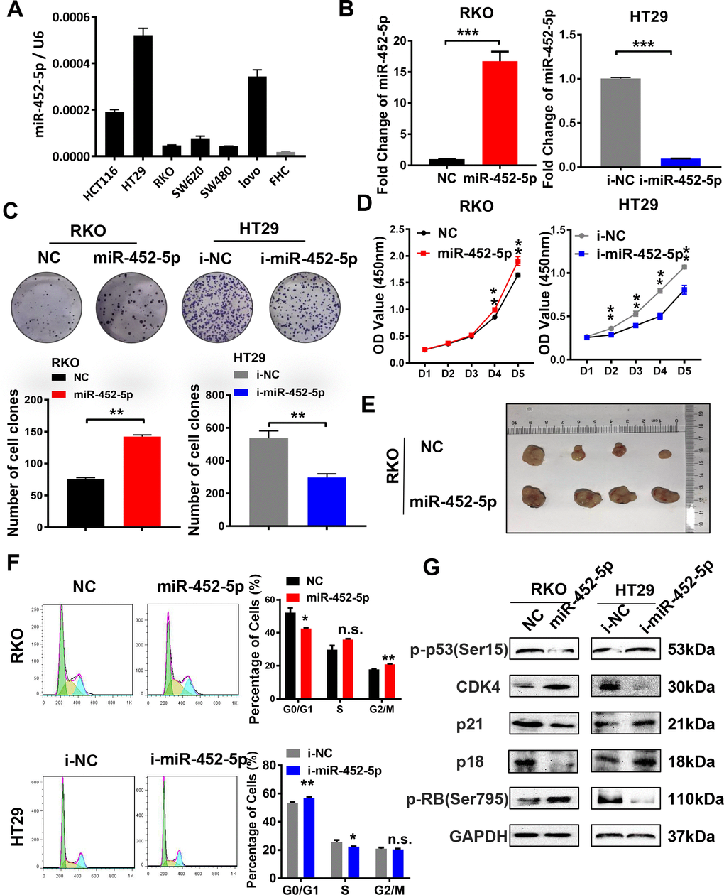 To further assess the biological functions of miR-452-5p in CRC, miR-452-5p expression was detected in normal colon epithelial cells (FHC) and six kinds of human CRC cells (LoVo, SW480, SW620, RKO, HT29, and HCT116) by qRT-PCR. According to our findings, miR-452-5p expression was relatively lower in the FHC cell line than in six kinds of CRC cells (Figure 2A). The RKO and HT29 cells with the least and highest miR-452-5p expression were chosen to transfect with miR-452-5p mimics and inhibitors, respectively. The transfection efficiency was confirmed by qRT-PCR (Figure 2B). To investigate the effect of miR-452-5p on CRC growth, CRC cell proliferation capacity in vitro was detected. As shown by clone formation assay, more clones were formed in RKO cells after miR-452-5p mimics transfection, while fewer clones were formed in HT29 cells transfected with miR-452-5p inhibitors (Figure 2C). Likewise, according to CCK-8 assay, miR-452-5p mimics transfection in RKO cells led to accelerated cell growth from day 4, while miR-452-5p inhibitor transfection in HT29 cells resulted in slower cell growth from day 2 (Figure 2D). Then, RKO-LV-NC and RKO-LV-miR-452-5p cells were inoculated subcutaneously to the nude mice, respectively, to determine whether miR-452-5p affected CRC proliferation in vivo. As a result, RKO-LV-miR-452-5p group displayed greater tumor size (Figure 2E), higher proliferation rate and heavier tumor weight (Supplementary Figure 1A, 1B). Moreover, to confirm the correlation of the proliferation promoting effect with cell cycle, cell cycle transformation was determined by flow cytometry. We revealed that miR-452-5p promoted the transformation of cell cycle in RKO cells, while miR-452-5p inhibitors in HT29 cells caused the arrest of cell cycle (Figure 2F). Also, western blotting was conducted to detect the cell cycle-associated protein levels. The results revealed that, miR-452-5p mimics down-regulated the protein levels of p53, p21 and p18 in RKO cells, while up-regulated those of CDK4 and p-rb. Inversely, miR-452-5p inhibitors up-regulated the expression of p18, p21 and p53 in HT29 cells, but down-regulated that of CDK4 and p-rb (Figure 2G and Supplementary Figure 3A). Taken together, miR-452-5p promoted the growth of CRC in vitro and in vivo, which indicated that miR-452-5p contributed to CRC growth.