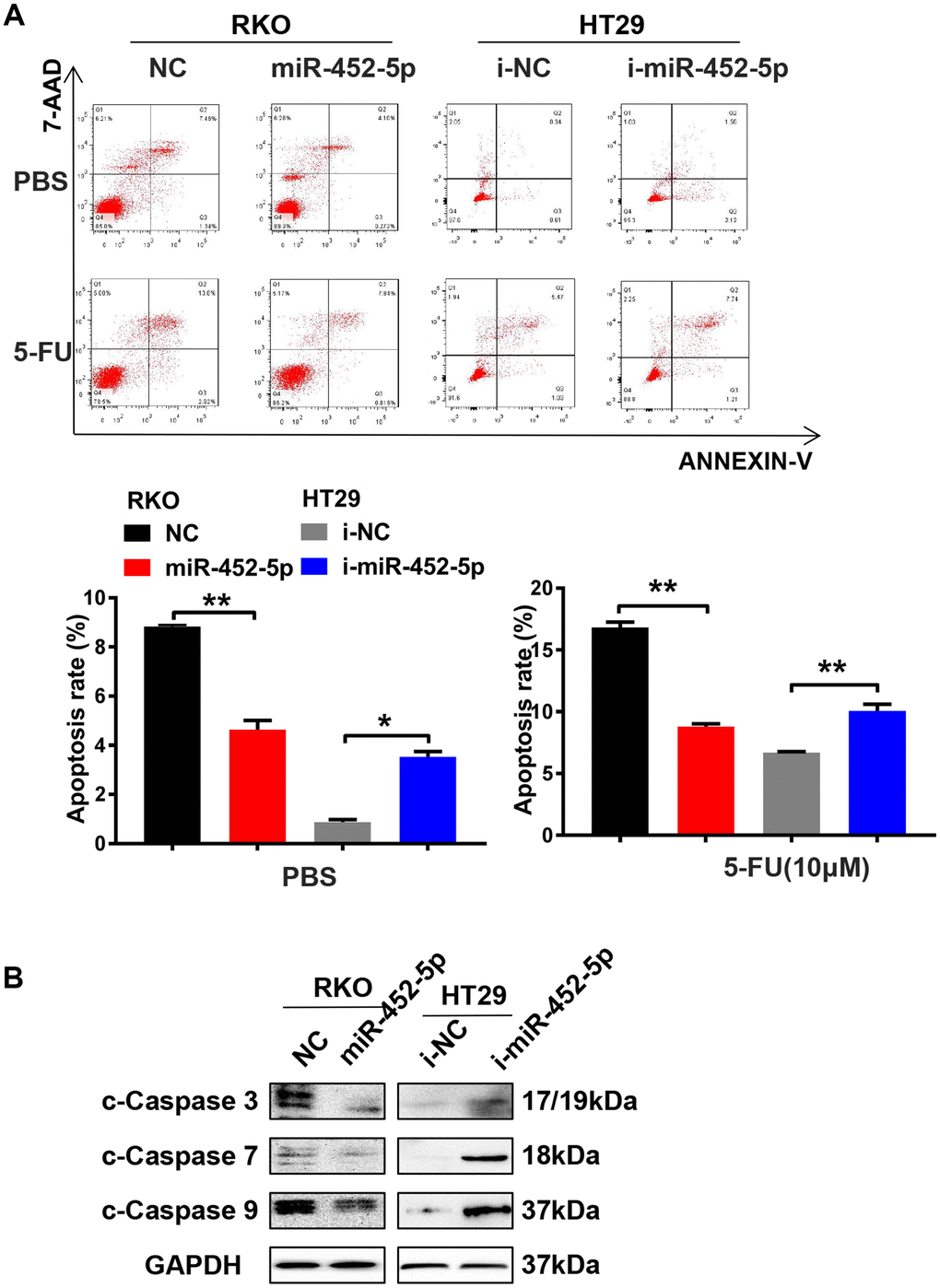 To further determine whether miR-452-5p affected CRC apoptosis, flow cytometry was conducted to investigate cell apoptosis. The results suggested that, overexpression of miR-452-5p reduced the apoptosis rate of RKO cells treated with PBS or 5-fluorouracil. Furthermore, HT29 cells treated with miR-452-5p inhibitors showed a higher apoptosis rate (Figure 3A). It suggested that miR-452-5p inhibited the chemosensitivity of CRC to 5-fluorouracil by reducing apoptosis. HT29 cells transfected with miR-452-5p inhibitors showed increased sensitivity to 5-FU and the IC50 values decreased, while the opposite results were observed in RKO cells with over-expression of miR-452-5p (Supplementary Figure 1C). Furthermore, the expression of apoptosis-associated proteins was detected by western blotting, which revealed that miR-452-5p mimics transfection in RKO cells led to down-regulation of apoptosis-associated protein levels, such as cleaved-caspase (c-caspase)3, c-caspase7, and c-caspase9. By contrast, transfection with miR-452-5p inhibitors up-regulated the levels of the above proteins within HT29 cells (Figure 3B and Supplementary Figure 3B). However, the full length caspases has also been tested but they do not show significant changes as the cleaved ones (Supplementary Figure 2A). These results indicated that, miR-452-5p repressed the apoptosis of cleaved-caspase proteins and thus reduced the chemosensitivity of CRC.