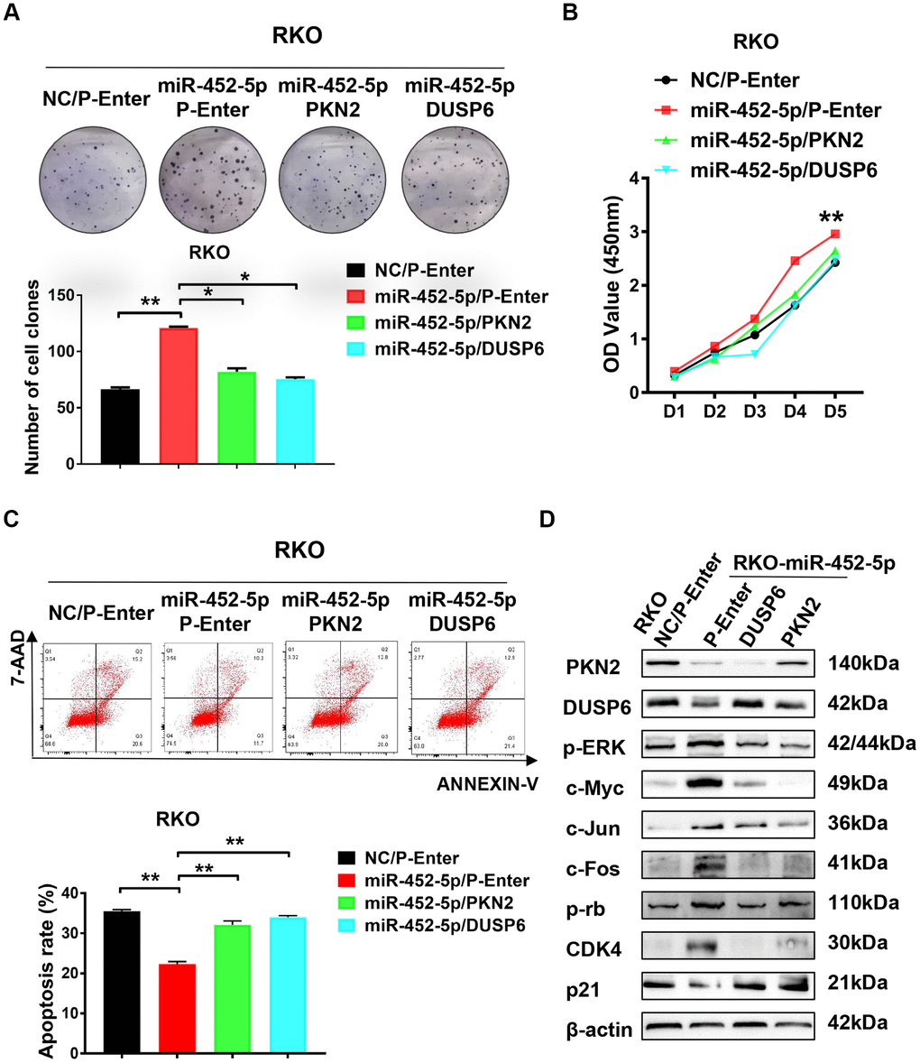 Colony formation assay was performed to verify whether PKN2/DUSP6 axis affected the effect of miR-452-5p on promoting CRC development. As a result, reversing the PKN2/DUSP6 axis restored the proliferation of cells induced by miR-452-5p (Figure 5A). Besides, RKO cells were used to perform CCK-8 assay, which also showed similar results that the PKN2/DUSP6 axis reversed the effect on promoting cell proliferation (Figure 5B). Next, we detected the effect of miR-452-5p-related apoptosis of 5-Fu-treated RKO cells. We found that such effect was rescued by restoring the PKN2/DUSP6 axis (Figure 5C). In line with the above findings, the PKN2/DUSP6 axis was suggested to play an important role in the development of CRC promoted by miR-452-5p. Furthermore, western blotting assay was performed to determine whether PKN2 or DUSP6 restored the activation of the ERK/MAPK pathway induced by miR-452-5p. According to our observation, the PKN2/DUSP6 axis played a vital role in suppressing the ERK/MAPK signaling proteins mediated by miR-452-5p, including p-ERK, c-Myc, c-Jun and c-Fos (Figure 5D and Supplementary Figure 3E). Also cell cycle and apoptosis signaling associated proteins mediated by miR-452-5p were restored by the PKN2/DUSP6 axis (Supplementary Figure 2C).