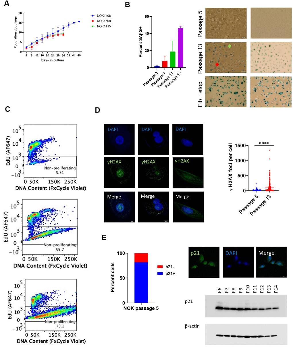 Flow cytometry for incorporation of the thymidine analog 5-ethynyl-2 deoxyuridine (EdU) into nuclear DNA, a measure of cell proliferation, revealed a decline in cells staining positive over time. All three donors showed a balance of proliferating and non-proliferating cells at passage 10 (Figure 1C and Supplementary Figure 1A). Analysis of DNA content showed a loss by senescent NOKs of a distinct cell population with the normal diploid content that was seen with proliferating cells (Figure 1C and Supplementary Figure 1A). This suggests that a portion of NOKs were arrested in a multinucleate state and/or experienced nuclear blebbing of chromatin fragments into the cytoplasm, both of which are features of senescence [15]. Staining for phosphorylated histone H2AX (γH2AX) showed such multinucleate cells and both nuclear and cytoplasmic γH2AX at passage 13 (Figure 1D and Supplementary Figure 1B). Quantification of combined nuclear and cytoplasmic γH2AX foci demonstrated a significant increase in unrepaired DNA double-strand breaks (DSBs) accompanying senescence (Figure 1D).