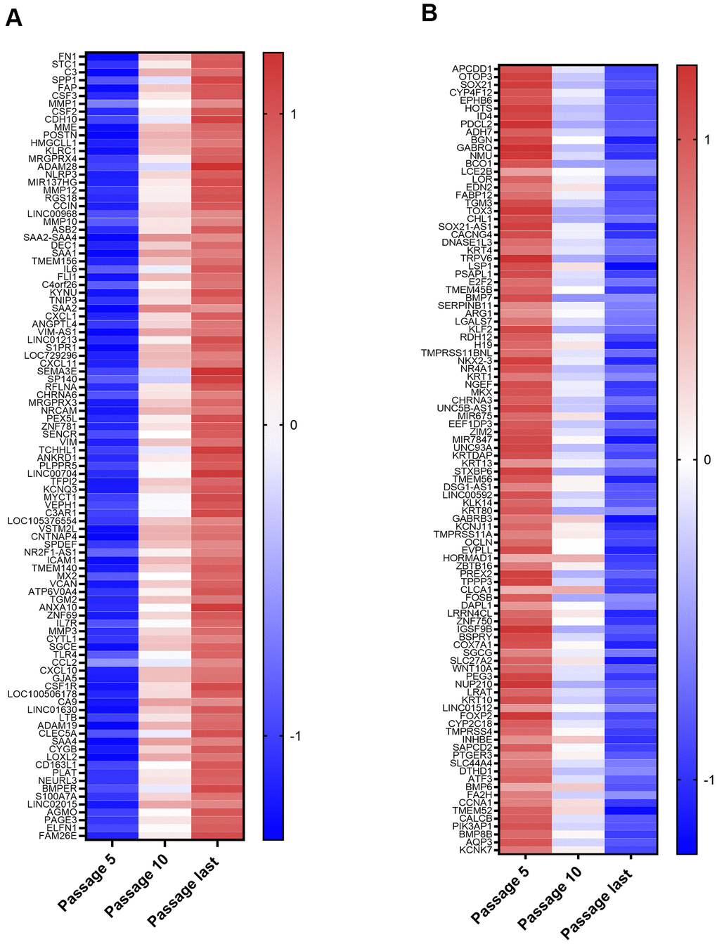 | 26 genes for SASP components were differentially expressed (p < 0.05 and log2 fold increase > 1.5 or decrease < -1.5), comparing the last passage to passage 5. | |||||||||||||||||||||||||||||||||||||||||||||||||||||||||||||||||||||||||||||||||||||||||||||||||||