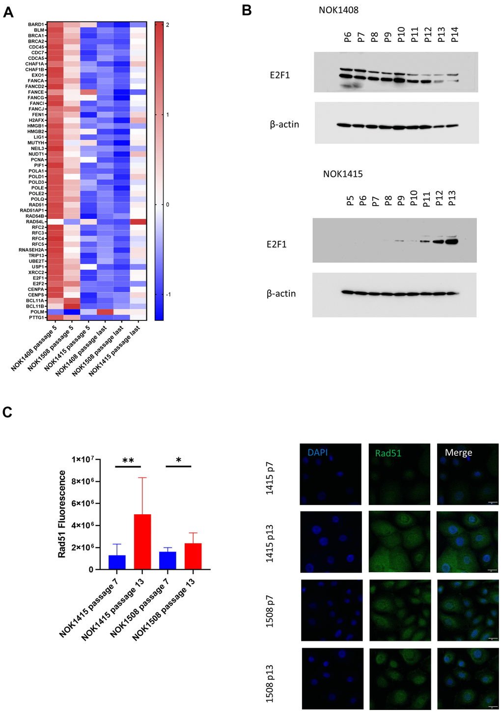 Since downregulation of DNA repair genes has previously been observed in senescence [20], we were surprised to find only a weak trend toward downregulation of these genes in our dataset. When we broke down the data by donor, we saw that elements of several DNA repair mechanisms were significantly down for the two female donors (Donors 1408 and 1508) (Figure 3A), but the pattern was in the opposite direction for the male donor (Donor 1415) (Figure 3A). There was, however, an increase in mRNA for DNA polymerase mu (POLM), which participates in non-homologous end-joining (NHEJ), for all three donors (Figure 3A). E2F1, a key transcription factor in DNA repair [20], was one of the genes demonstrating the divergent pattern at the mRNA level (Supplementary Table 1). Corresponding with the mRNA, we found that the amount of E2F1 protein decreased with senescence for one of the female donors (Figure 3B and Supplementary Figure 4B), but increased with senescence for the male donor (Figure 3B and Supplementary Figure 4C). The multiple bands on the blots are likely due to alternatively spliced versions of the protein [21]. We also performed IF staining of cells for Rad51, the protein product of another DNA repair gene that showed the divergent, donor-specific pattern at the mRNA level (Figure 3C). Rad51 mediates the repair of DNA DSBs by facilitating homologous recombination [22]. Although average fluorescence per cell increased with senescence for both the male (NOK1415) and female (NOK1508) donors, the increase was much stronger for the male donor compared to the female donor. Rad51 fluorescence increased four-fold for the male donor, but only 50% for the female donor, comparing passage 13 to passage 7 (Figure 3C). The greater increase in protein for the male donor is consistent with the increase in RAD51 mRNA for that donor. The results for the female donor suggest that post-transcriptional mechanisms lead to some increase in the amount of Rad51 protein, despite downregulation of the mRNA.