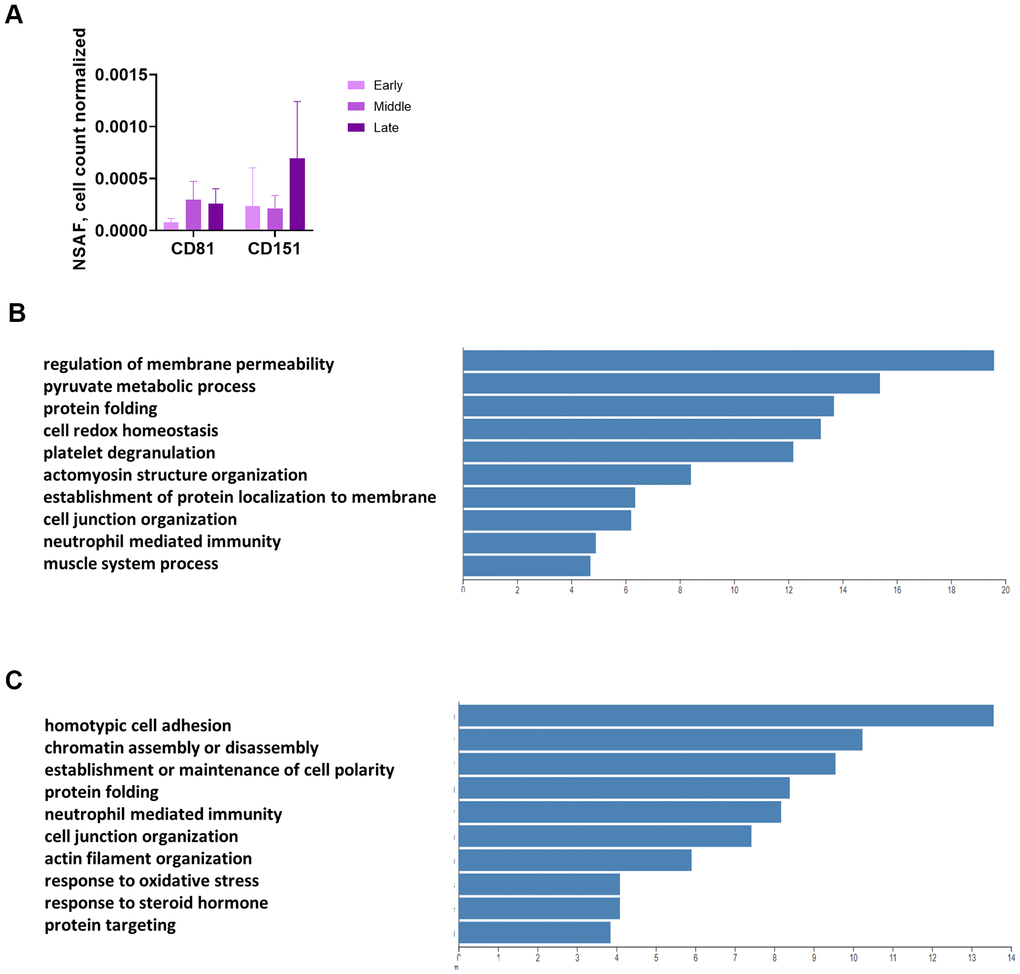 We also analyzed the mass spec results from CM and the EV pellet for significant (p < 0.05) changes, comparing each of the three stages (Supplementary Tables 4, 5). The top five proteins for five of the six comparisons changed upward (Table 1A–1E). The exception was changes in the EV pellet from early stage to mid stage, for which two proteins, components of the 60S ribosomal subunit (L36a and L36a-like), declined significantly (Table 1F). As the software can attribute the same spectral counts to two proteins that contain the same peptides, and these two proteins are similar, only one of them may actually have changed significantly.