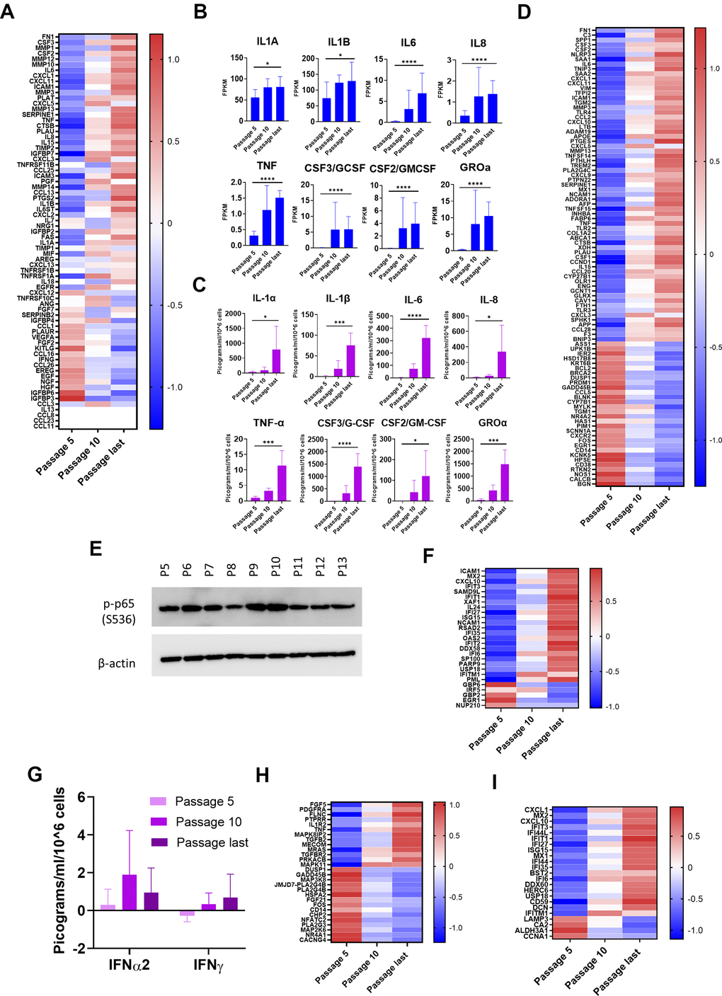 Three major inflammatory pathways have been found to be upregulated in senescence: NF-κB, cGAS-STING (cyclic GMP-AMP synthase-stimulator of interferon genes), and p38MAPK. Initially, NF-κB is activated as part of the DNA damage response [28]. Nuclear or mitochondrial DNA (mtDNA) in the cytosol is detected by cGAS; this triggers the STING pathway, which activates the IFN and NF-κB signaling pathways [15, 29]. Activation of p38MAPK in senescent cells has also been found to increase NF-κB transcriptional activity [30]. Our RNA-seq results showed strong upregulation of many elements of the NF-κB pathway (Figure 5D). Upregulated genes include activators of NF-κB (e.g., TLR3 and TLR4) and NF-κB target genes that either are (e.g., CTSB, IL6) or are not (e.g., APOE, C3) SASP components. Transcription of a few genes (e.g., CXCL3, CXCL5) rose in the early stages, and then declined. This might suggest a partially successful effort to dampen the inflammatory cycle. Immunoblotting confirmed the presence of transcriptionally active NF-κB from passage 5 to the last passage (Figure 5E). IFN pathways were also upregulated at the mRNA level (Figure 5F). This occurred despite the fact that mRNA FPKM measurement was zero or fractional for IFN-γ, IFN-β, and 13 subtypes of IFN-α, for nearly all samples (Supplementary Table 1), and the highest concentration of secreted IFNs measured was in the low single-digits of picograms per milliliter (Figure 5G). This is less than 0.1% of the amount used to induce transcription of IFN pathway genes in cell culture [31]. Upregulation of IFN signaling pathways despite a lack of IFNs is a phenomenon previously observed in cellular senescence as a consequence of chromatin release into the cytoplasm [15], and in response to chronic mtDNA-mediated cGAS-STING signaling [32]. It likely denotes either a cell-intrinsic, IFN-independent mechanism or an adaptation to chronic, low-level IFN signaling. Among the genes upregulated were a promoter of apoptosis (XAF1), and a number of IFN-induced genes (e.g., CXCL10, IFI6, IFIT1, IFIT2, IFIT3, ISG15, OAS2). A few IFN pathway genes (e.g., EGR1, GBP2, NUP210) were downregulated (Figure 5F). Downregulation of EGR1, a transcription factor for a suppressor of cytokine signaling, is consistent with upregulation of IFN-like signaling. One of the four p38MAPK genes, MAPK11, was significantly increased, and an inhibitor, CHP2, was significantly decreased (Figure 5H). The pattern of dominance in upregulation of inflammatory signaling that is seen with the NF-κB and IFN pathways is, however, absent.