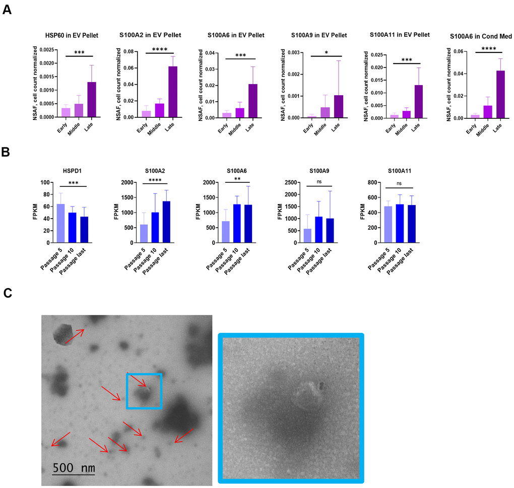 An important motivation to our work was to identify unacknowledged aspects of senescence that are evidenced more strongly in epithelial cells relative to fibroblasts, or that may be unique to epithelial cells. Based on our mass spectrometry results, we suggest addition of the following proteins to a more epithelial-inclusive SASP: heat shock protein 60 (HSP60), S100A2, S100A6, S100A9, and S100A11. We selected these for two reasons. First, we found these proteins, in quantities that were significantly higher at late passages than early, in the EV pellet or both the EV pellet and CM (Figure 6A). Second, each of these proteins is an endogenous ligand for one of two pro-inflammatory pattern-recognition receptors: the receptor for advanced glycation end products (RAGE) and Toll-like receptor 4 (TLR4) [37–39]. At the mRNA level, only S100A2 and S100A6 significantly increased, and HSP60 mRNA declined significantly with senescence (Figure 6B).