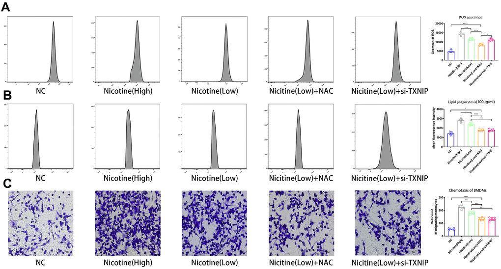 To investigate the effect of nicotine on macrophage migration, we performed a macrophage chemotaxis assay on BMDMs (Figure 2C). The transwell assay revealed that the migration capacity of BMDMs increased with nicotine concentration [nicotine (high) vs. nicotine (low), P=0.0006; nicotine (low) vs. NC, P<0.0001]. Likewise, the migration capacity of BMDMs was suppressed due to NAC administration to eliminate its ROS production [nicotine (low) vs. nicotine (low) + NAC, P=0.0002; nicotine (low) vs. nicotine (low) + si-TXNIP, P=0.0002;].