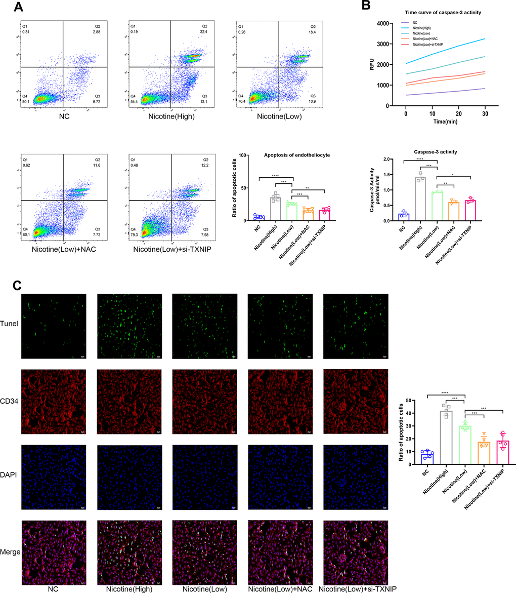 Mice aortic endothelial cells was isolated from 8 week-old wild type C57BL/6 mice as previously described [43]. Briefly, mice aorta was cut into 1 mm rings. Each segment was seeded onto a growth factor-reduced matrix with the endothelium facing down on the plate. Every piece of endothelium was cultured in endothelial cell growth medium for 3-4 days. The endothelial cells started extending on day 2. These segments of aorta were then removed, and the cells cultured until they reached confluence. Endothelial cells were used for experiments after two passages. Endothelial cells were co-cultured with BMDM in a 0.4 μm 12 well-transwell system. BMDMs were pretreated with different concentrations of nicotine (1 μM, 3 μM) with or without NAC (5 mM) for 24 h, then they were harvested and seeded onto the upper compartment of the transwell system. Endothelial cells were seeded onto the lower compartment of the transwell system and co-cultured with BMDM for 24 h. After the endothelial cells were harvested, their apoptosis levels were evaluated by Annexin V-PI (AD10, Dojindo, Japan), TUNEL (11684795910, Roche, USA, and caspase-3 activity (ab252897, Abcam, USA). Experimental procedures followed the manufacturer's instructions.