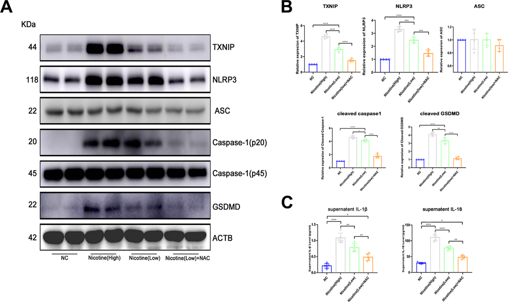 Based on the finding of nicotine stimulating ROS production and TXNIP upregulation, we speculated that activation of the pyroptosis pathway played a critical role in nicotine-induced monocyte/macrophage dysfunction (Figure 4A, 4B). To clarify the downstream ROS and TXNIP, we assayed pyroptosis-associated protein expression, including NLRP3, ASC, caspase-1, and gasdermin D(GSDMD). TXNIP expression significantly increased in BMDMs treated with increasing doses of nicotine [nicotine (high) vs. nicotine (low), P<0.0001; nicotine (low) vs. NC, P<0.0001].