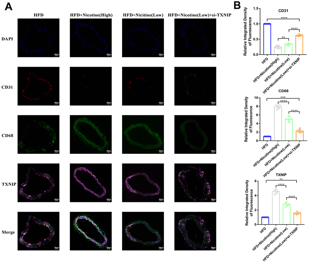 Figure 6A, 6B demonstrates that nicotine promoted CD68+ expression in the brachiocephalic trunk cross-section vessel wall, which indicates that CD68+ cells (mainly macrophages) had stronger chemotaxis to the lipids deposited in the vessel wall under HFD conditions. The integrated density of CD68 fluorescence increased with an increase in nicotine concentration [HFD + nicotine (high) vs. HFD + nicotine (low), P<0.0001; HFD + nicotine (low) vs. HFD, P<0.0001]. Silencing TXNIP inhibited CD68 expression in the brachiocephalic trunk [HFD + nicotine (low) vs. HFD + nicotine (low) + si-TXNIP, P<0.0001]. These findings suggest that nicotine promoted chemotaxis of macrophages partly through regulating TXNIP expression. In addition, TXNIP expression in the vessel wall was elevated with increasing nicotine dose [HFD + nicotine (low) vs. HFD, P<0.0001; HFD + nicotine (high) vs. HFD + nicotine (low), P<0.0001]. Similar to the results of Figure 4E, the integrity and fluorescence intensity of CD31 (endothelial cells) was suppressed with increased concentrations of nicotine. This trend was inhibited by silencing TXNIP expression.