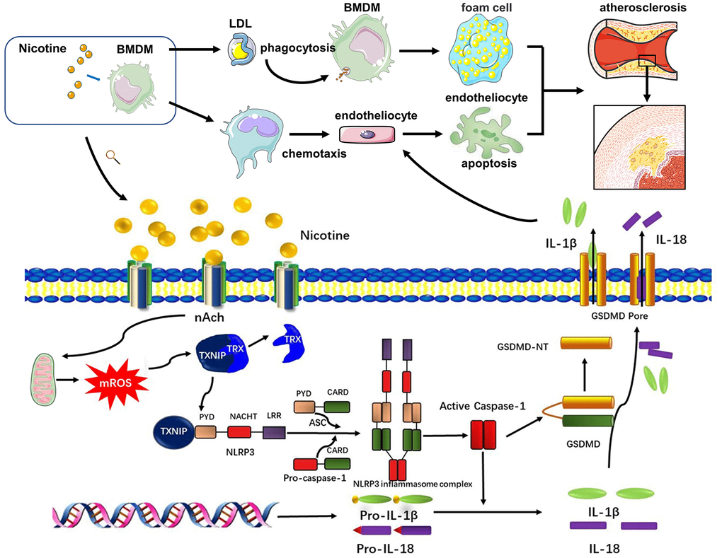 We hypothesized that nicotine may trigger inflammasome activation through ROS production, particularly mitochondrial reactive oxygen species (mROS), which is the initiating link of pyroptosis. After ROS activation, TXNIP can dissociate from TRX and bind to NLRP3, further activating NLRP3 inflammasomes. Activated pyroptosis pathways eventually cause GSDMD to have biological effects that aggravate atherosclerosis. In this study, we treated ApoE(-/-) mice and bone marrow-derived macrophages (BMDM) with nicotine and investigated the mechanism of nicotine-triggered BMDM dysfunction.