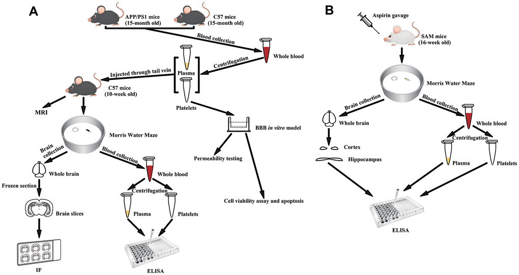 In this study, AD model mice, namely, SAM mice and APP/PS1 mice, were used to investigate the relationship between platelets and the AD process in aged mice. We designed experiments by injecting platelets to explore their possible effects on the AD process, while an in vitro BBB model was chosen to explore the underlying mechanisms.