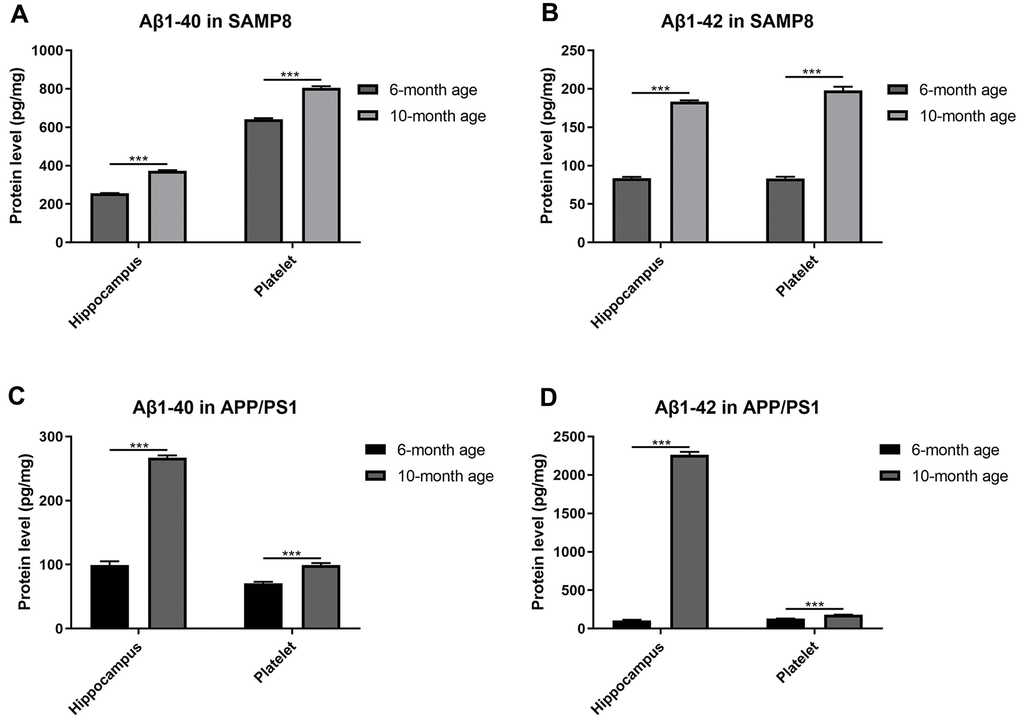 As expected, both the Aβ1-40 and Aβ1-42 contents increased in the hippocampus of SAMP8 mice (Figure 2A, 2B) and APP/PS1 mice (Figure 2C, 2D) with increasing age, suggesting that aged SAMP8 and APP/PS1 models mice shared similar pathological changes in Aβ deposition. Moreover, we observed the same trend of elevated levels of Aβ1-40 and Aβ1-42 in platelets from elderly SAMP8 and APP/PS1 mice.