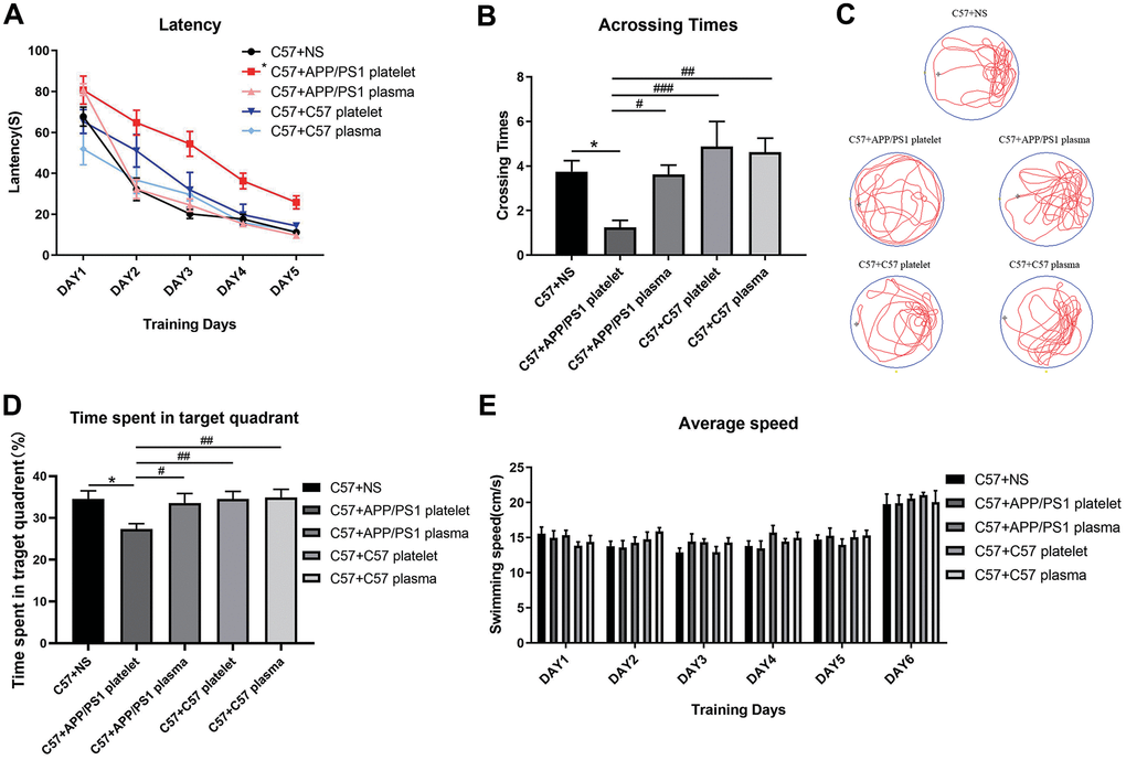 Subsequently, we chose 15-month-old APP/PS1 mice as donors to provide platelets and plasma, 15-month-old C57 mice as negative control donors, and saline as a blank control. We performed the MWM test to evaluate learning and memory abilities. The group injected with platelets from APP/PS1 mice required an increased latency to find the hidden platform compared with the saline-treated mouse group, while the other 3 groups did not show a significant reduction in latency time (Figure 3A). Similarly, the number of crossings over the platform site was significantly reduced in the group injected with platelets from APP/PS1 mice compared with the other three groups of mice (Figure 3B). Furthermore, a marked difference in the track map of the probe test was observed among the treated groups (Figure 3C). Additionally, a significant decrease in the total time spent in the target quadrant was observed in the APP/PS1 platelet-treated mouse group compared with the other groups (Figure 3D). The average daily speed of each group was not significantly different, which supports the conclusions described above (Figure 3E).