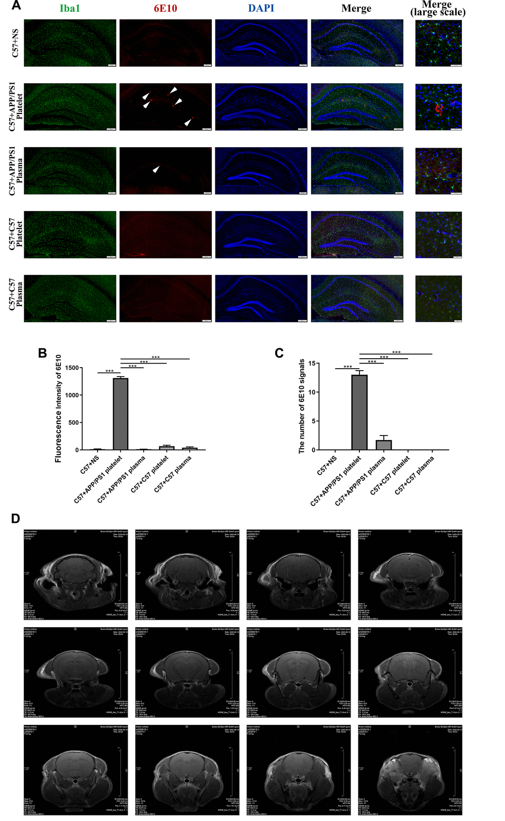 Fifteen-month-old APP+/PS1+ mice and fifteen-month-old C57BL/6 mice were used to provide platelets and plasma for the following experiment. Ten-week-old C57BL/6 mice were randomly divided into 5 groups, with 8 mice in each group (4 of each sex) separated into 2 cages by sex. They were injected with platelets (C57+APP/PS1 platelets) or plasma without platelets (C57+APP/PS1 plasma) from 15-month0old APP+/PS1+ mice; or platelets (C57+C57 platelets) or plasma without platelets (C57+C57 plasma) from 15-month-old C57BL/6 mice; or physiological saline (C57+NS) through tail vein as mentioned above. The experimental design is shown in Figure 1A.
