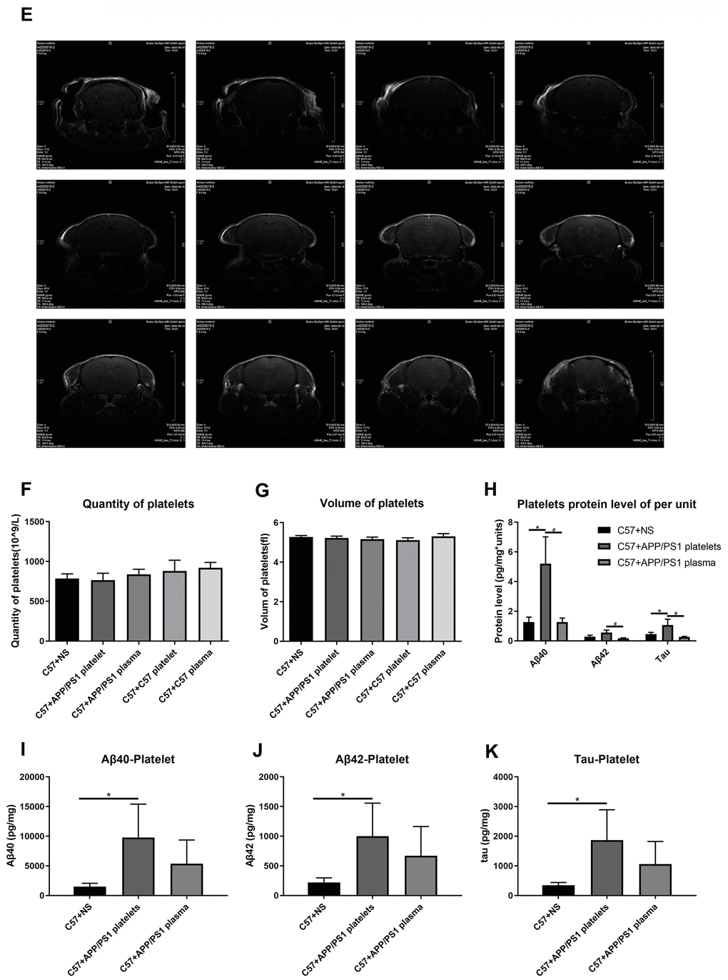 (E) Brain image of a C57+APP/PS1 platelet mouse by MRI. (F) Quantity of platelets. (G) Volume of platelets. Each group included 8 mice. No significant differences were observed between groups. (H) Aβ1-40, Aβ1-42 and tau protein levels per unit of platelets. (I) Aβ1-40 levels in platelets. (J) Aβ1-42 levels in platelets. (K) Tau levels in platelets. Each group included 8 mice. *P<0.05 compared with C57+NS and #P<0.05 compared with C57+APP/PS1 platelets.