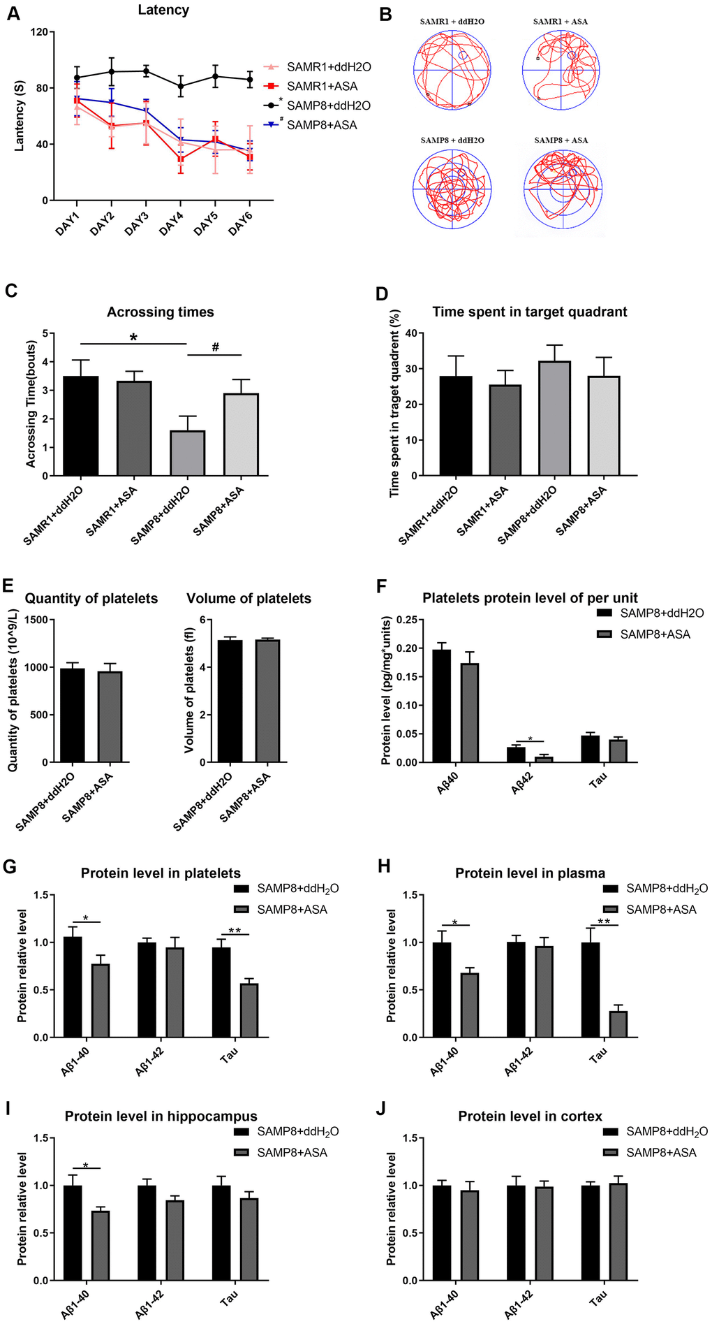 Sixteen-week-old SAMP8 mice were randomly divided into 2 groups, with 16 mice in each group (8 males and 8 females) separated into 4 cages by sex. Sixteen-week-old SAMR1 mice were randomly divided into 2 groups, with 6 mice each group (3 of each sex) separated into 2 cages by sex. ASA (SAMP8/SAMR1 + ASA) or the same volume of water (SAMP8/SAMR1 + ddH2O) was administered to the mice by gavage daily for 9 weeks. Ten SAMP8 mice and 6 SAMR1 mice were randomly selected for Morris water maze (MWM) experiments. Blood samples from all SAMP8 mice were used to measure Aβ1-40 and Aβ1-42 levels in platelets and plasma, and 10 blood samples were randomly selected to measure tau levels in platelets and plasma. Ten brain tissue samples were randomly selected to measure Aβ1-40, Aβ1-42 and tau levels in the hippocampus and cortex. The experimental design is shown in Figure 1B.