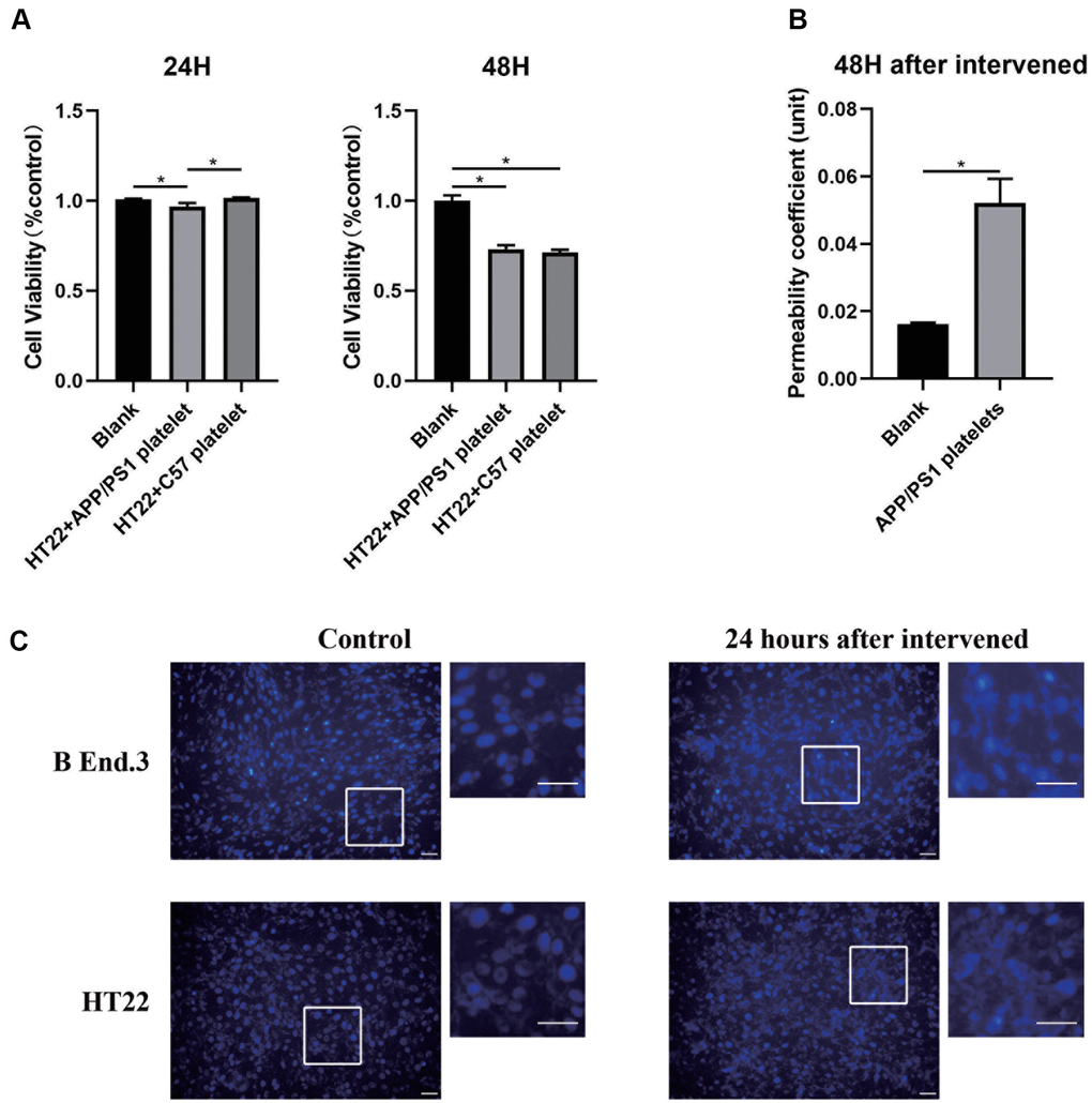 We designed an in vitro model of the BBB by referring to previous studies to explore the cellular mechanisms by which platelets may affect the BBB. We first evaluated the cell apoptosis level after treatment with platelets from aged APP/PS1 mice using the CCK-8 assay and Hoechst-33342 staining. The results illustrated different degrees of apoptosis, the occurrence of nucleation, and a decrease in the cellular activity of both in b End.3 and HT22 cells (Figure 6A, 6C). We measured the permeability of the BBB in an in vitro model before and after treatment with platelets, and found that the permeability increased after the intervention (Figure 6B). Therefore, the platelets damaged the biological characteristics of the in vitro BBB model.