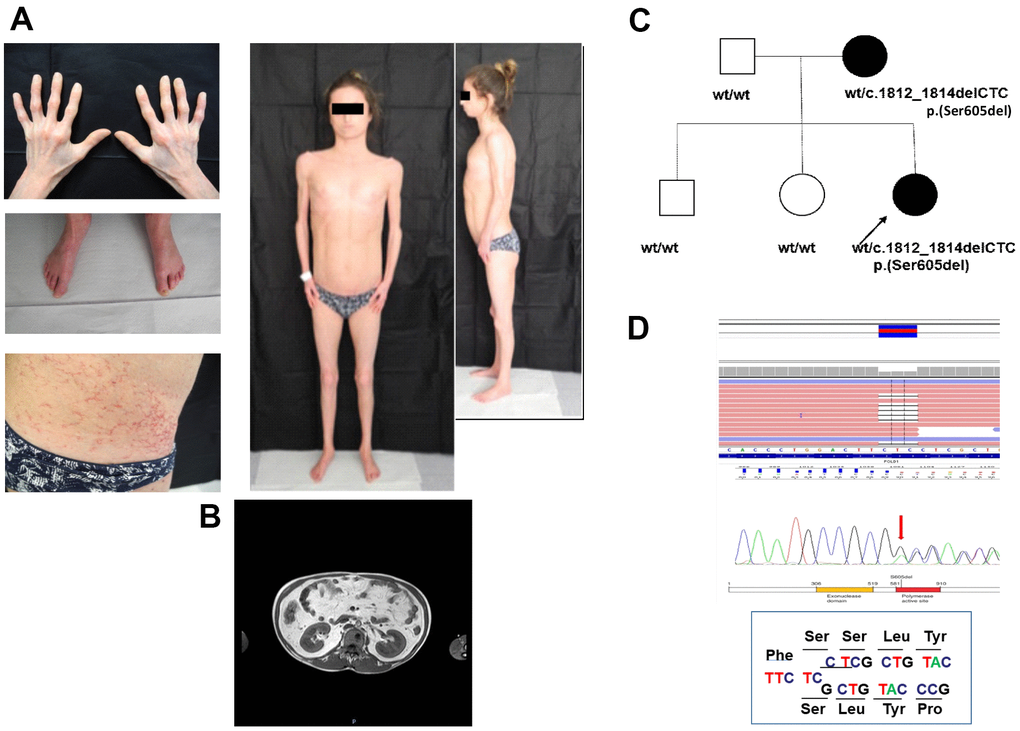 MDPL clinical diagnosis was done at 21 years old, although the mother reported growth retardation since the proband was 3 years old (Figure 1A). At the time of the diagnosis, the patient was normotensive with a BMI of 19.5. Although fasting plasma glucose concentration was normal, an oral glucose challenge revealed type 2 diabetes with marked hyperinsulinemia compatible with extreme insulin resistance. Skin scleroderma, telangiectasia, and subcutaneous lipoatrophy were clinically evident throughout the body concurrently with reduced limb muscle mass (Figure 1A). A DEXA scan detected percentages of fat at both the upper and lower limb <10%, whereas bone mineral density at lumbar and femoral sites was in the osteopenic range (data not shown). MRI of the abdomen showed an over-representation of mesenteric fat, as reported in other cases of MDPL (Figure 1B). Finally she had primary amenorrhea. Clinical signs of MDPL in the mother were very mild.