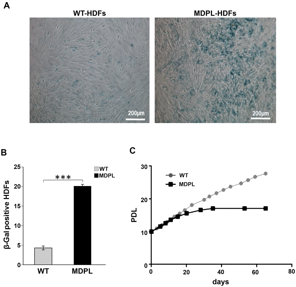 To further explore the leading senescence process, a β-galactosidase assay has been performed in which WT and MDPL-HDFs have been compared at the same number of passages. A higher number of senescent cells was detected in MDPL-HDFs (20%) when compared to WT β-galactosidase-positive cells (4.3%) (p<0.001) (Figure 2A, 2B). Successively, we evaluated a possible growth decline along a long-term culture, exploring growth trend in relation to the length of the doubling time. MDPL-HDFs showed a growth decrease parallel to an increase of the doubling time, leading to a growth crisis with clear signs of cellular senescence (Figure 2C).